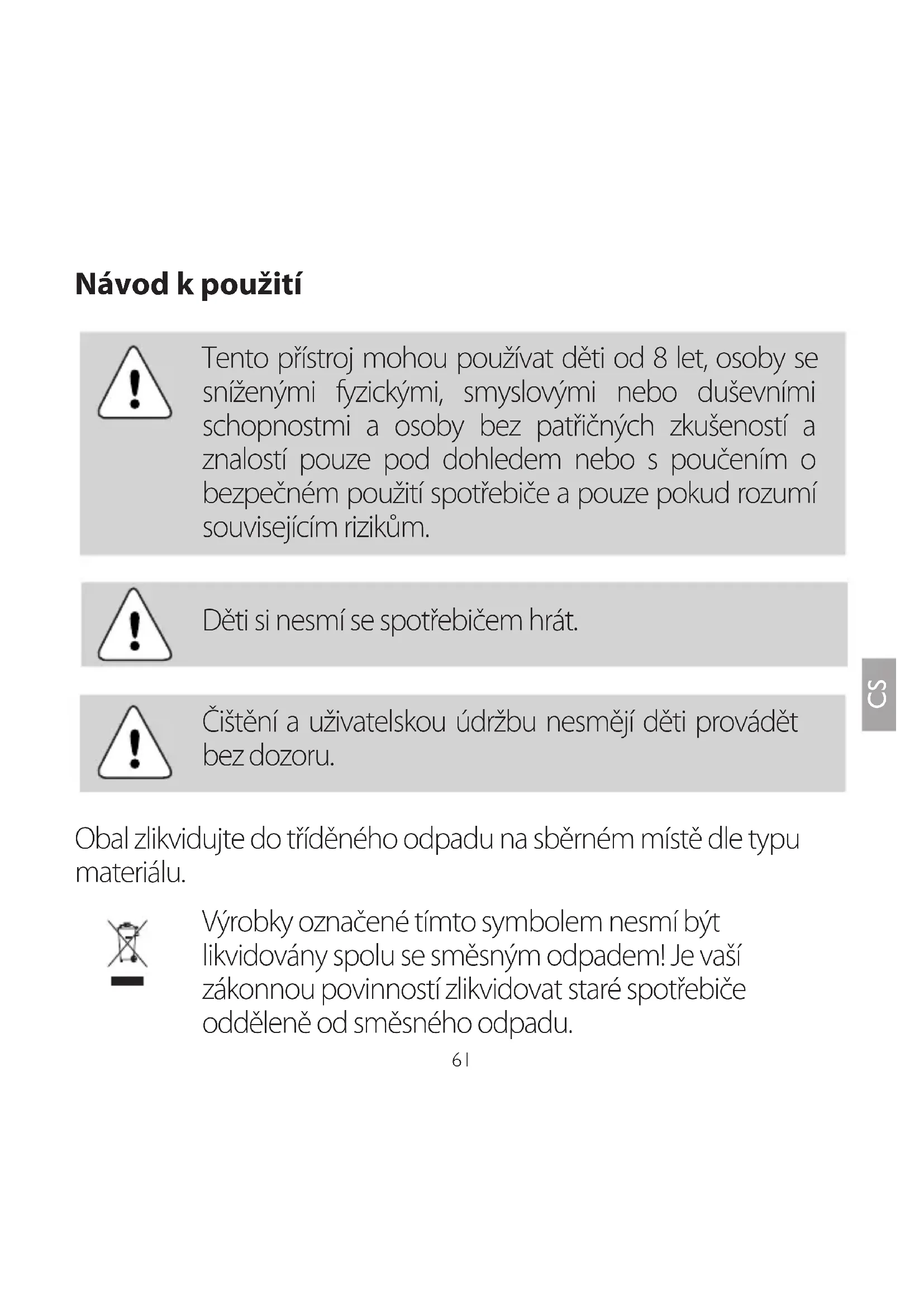 Tento přístroj mohou používat děti od 8 let, osoby se sníženými fyzickými, smyslovými nebo duševními schopnostmi a osoby bez patřičných zkušeností a znalostí pouze pod dohledem nebo s poučením o bezpečném použití spotřebiče a pouze pokud rozumí souvisejícím rizikům.