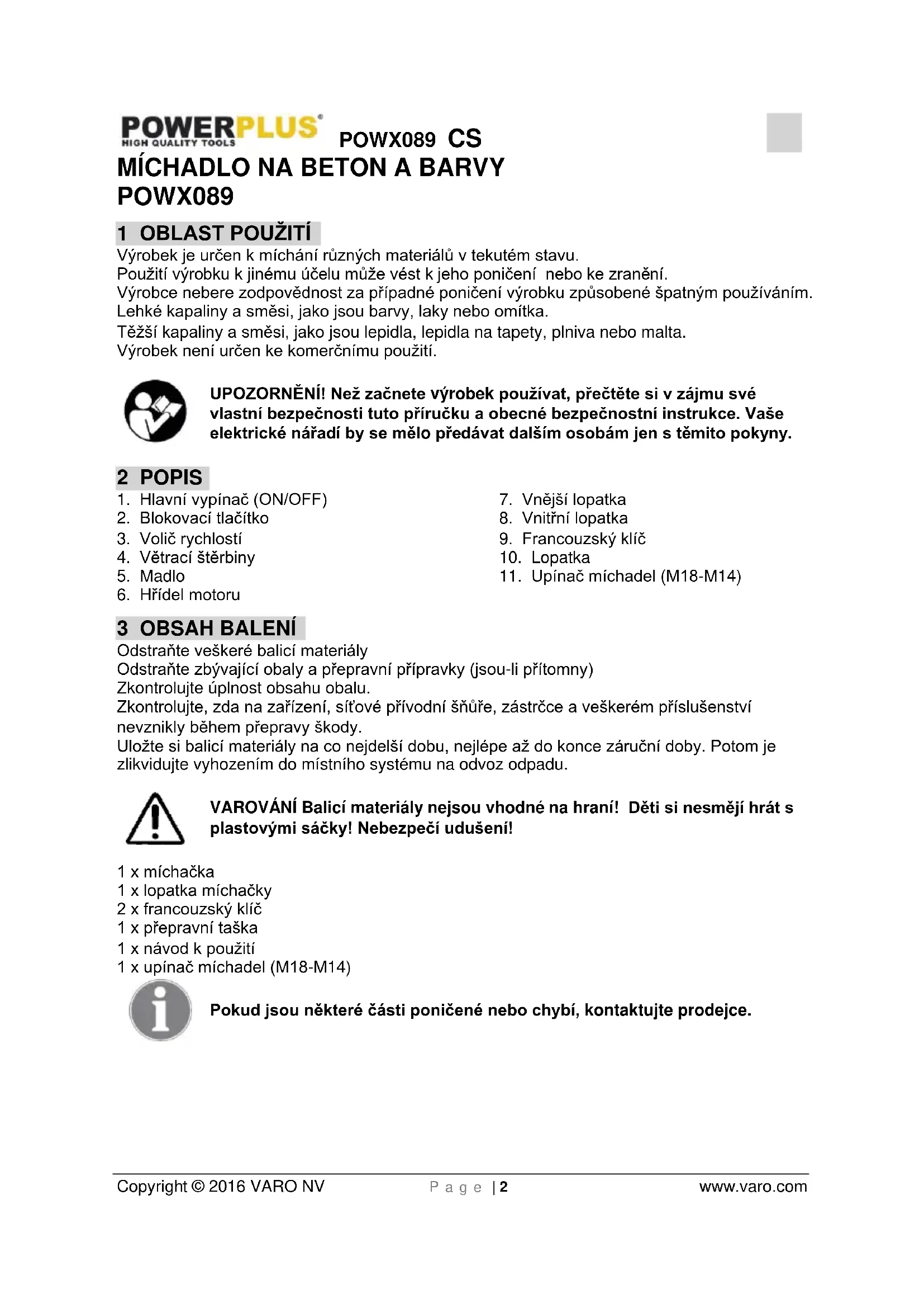 Použité zařízení nelikvidujte spolu s běžným domovním odpadem, ale řiďte se předpisy vydanými s ohledem na ochranu životního prostředí. Laskavě likvidujte použitý motorový olej způsobem slučitelným s péči o životní prostředí. Navrhujeme vzít jej v uzavřeném kanystru na svou místní servisní stanici k regeneraci. Nevyhazujte jej do odpadu ani jej nevylévejte na zem.POWX089 CS Copyright © 2016 VARO NV P a g e | 8 www.varo.com
