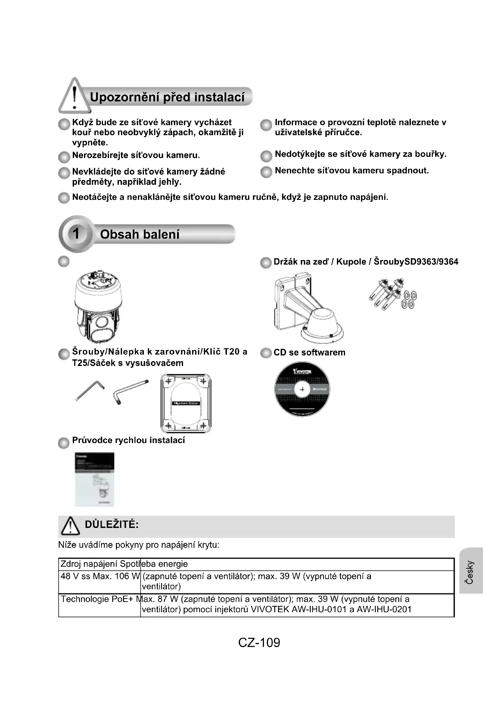 Эти устройства (ИК СД-лампы) излучают невидимый высоко-концентрированный инфракрасный свет с плавно изменяемым углом охвата (диапазоном), соответствующим режиму работы. Во избежание поражения глаз не смотрите непосредственно на ИК СД- лампы с малого расстояния; помните, что для проверки активности ИК-подсветки следует пользоваться экраном изображения камеры.CZ-109 Česky Upozornění před instalací Informace o provozní teplotě naleznete v uživatelské příručce. Když bude ze síťové kamery vycházet kouř nebo neobvyklý zápach, okamžitě ji vypněte. Nedotýkejte se síťové kamery za bouřky. Nerozebírejte síťovou kameru. Nenechte síťovou kameru spadnout. Nevkládejte do síťové kamery žádné předměty, například jehly. Neotáčejte a nenaklánějte síťovou kameru ručně, když je zapnuto napájení. Obsah balení