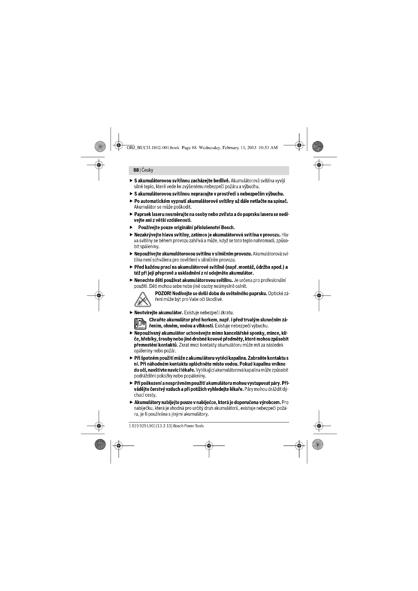 Provozní teplota °C – 10 ... +40 Skladovací teplota °C – 15 ... +50 Hmotnost podle EPTA-Procedure 01/2003 kg 0,3 OBJ_BUCH-1802-001.book Page 89 Wednesday, February 13, 2013 10:53 AM90 | Česky 1 619 929 L90 | (13.2.13) Bosch Power Tools Montáž Nabíjení akumulátoru (příslušenství) (vizobr. A) Používejte pouze nabíječky uvedené na straně příslušenství. Jen tyto nabíječ- ky jsou vyladěné na akumulátory Li-ion použité ve Vaší akumulátorové svítilně. Upozornění: Akumulátor se expeduje částečně nabitý. Pro zaručení plného výkonu akumulátoru jej před prvním nasazením v nabíječce zcela nabijte. Akumulátor Li-ion lze bez zkrácení životnosti kdykoli nabít. Přerušení procesu nabíje- ní nepoškozuje akumulátor. Akumulátor Li-ion je díky „Electronic Cell Protection (ECP)“ chráněn proti hlubokému vybití. U vybitého akumulátoru se ochranným obvodem akumulátorová svítilna vy- pne. Po automatickém vypnutí akumulátorové svítilny už dále netlačte na spínač. Akumulátor se může poškodit. Pro odejmutí akumulátoru 3 stlačte odjišťovací tlačítka 4 a akumulátor vytáhněte do- zadu z akumulátorové svítilny. Nepoužívejte přitom žádné násilí. Akumulátor je vybaven kontrolou teploty NTC, která dovolí nabíjení pouze v rozmezí teplot 0 °C a 45 °C. Tím se dosáhne vysoké životnosti akumulátoru. Dbejte upozornění k zpracování odpadu. Provoz Uvedení do provozu Nasazení akumulátoru Používejte pouze originální akumulátory Li-ion firmy Bosch s napětím uvede- ným na typovém štítku Vaší akumulátorové svítilny. Použití jiných akumulátorů může vést ke zraněním a k nebezpečí požáru. Nasaďte nabitý akumulátor 3 do držadla až znatelně zaskočí a přesvědčivě přiléhá k držadlu. Zapnutí – vypnutí Akumulátorová svítilna vytváří paprsek světla, jež vystupuje z hlavy svítilny