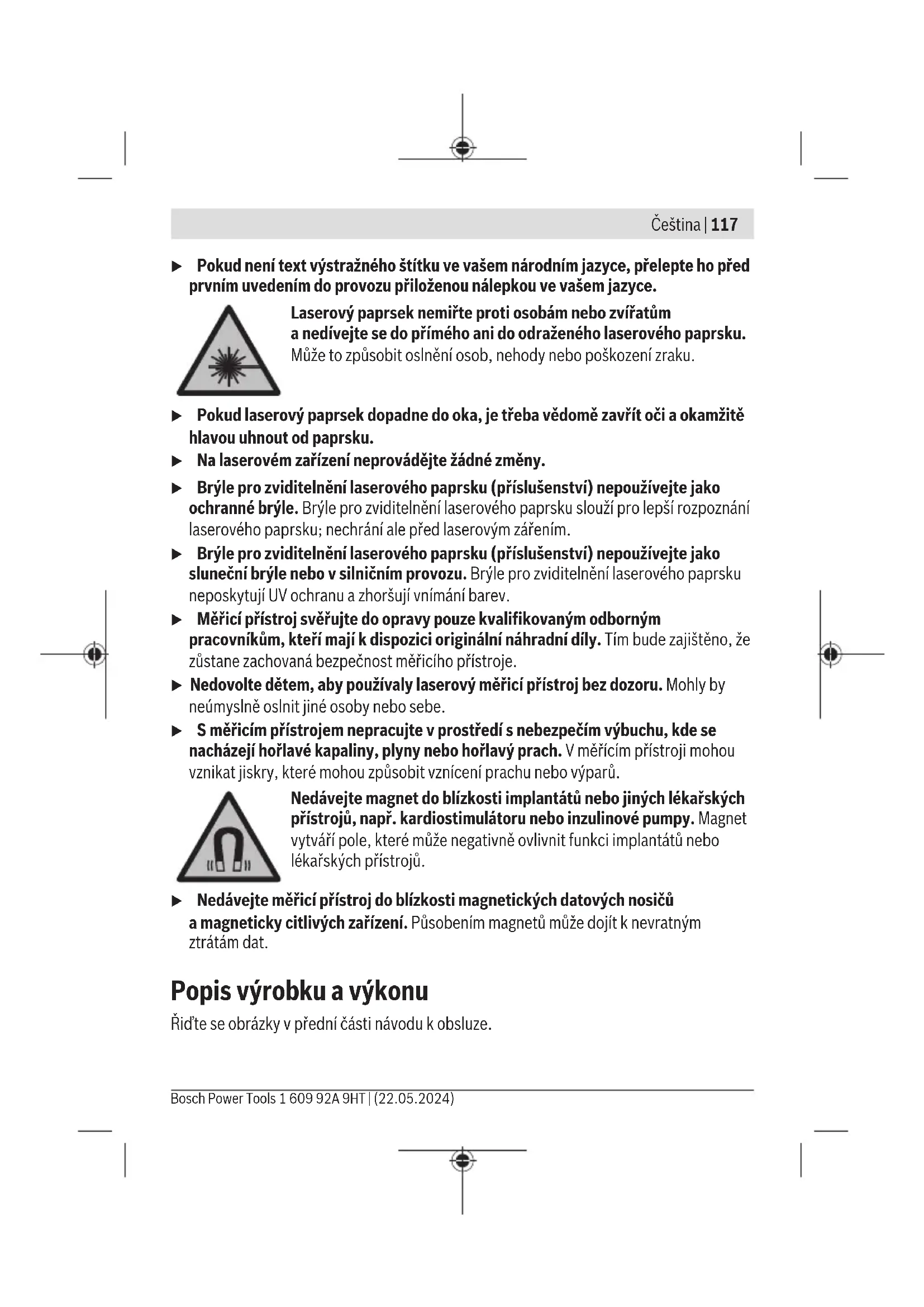 při 20–25°C C) Uvedené hodnoty platí za předpokladu normálních až příznivých podmínek prostředí (např. bez vibrací, bez mlhy, bez kouře, bez přímého slunečního záření). Po velkém kolísání teploty může dojít kodchylkám přesnosti. D) Vyskytuje se pouze nevodivé znečištění, přičemž příležitostně se ale očekává dočasná vodivost způsobená orosením. E) Hmotnost bez baterií/akumulátorů Kjednoznačné identifikaci měřicího přístroje slouží sériové číslo (10) na typovém štítku. Bosch Power Tools 1 609 92A 9HT | (22.05.2024)120 | Čeština Montáž Vložení/výměna baterií Pro provoz měřicího přístroje doporučujeme použít alkalicko-manganové baterie nebo akumulátory. Pro otevření krytu přihrádky pro baterie(8) stiskněte aretaci(7) akryt přihrádky pro baterie sejměte. Vložte baterie, resp. akumulátory. Přitom dodržujte správnou polaritu podle vyobrazení na vnitřní straně přihrádky baterie. Když jsou baterie, resp. akumulátory vybité, svítí ukazatel stavu(3) červeně alaserové paprsky se vypnou. Vypněte měřicí přístroj avyměňte baterie, resp. akumulátory. Vyměňte vždy všechny baterie, resp. akumulátory současně. Použijte pouze baterie nebo akumulátory jednoho výrobce astejné kapacity. u Když měřicí přístroj delší dobu nepoužíváte, vyjměte zněj baterie, resp. akumulátory. Baterie aakumulátory mohou při delším skladování vměřicím přístroji zkorodovat. Provoz Uvedení do provozu u Chraňte měřicí přístroj před vlhkem apřímým slunečním zářením. u Nevystavujte měřicí přístroj extrémním teplotám nebo kolísání teplot. Nenechávejte ho např. delší dobu ležet vautě. Při větším kolísání teplot nechte měřicí přístroj nejprve vytemperovat, než ho uvedete do provozu. Při extrémních teplotách nebo teplotních výkyvech může být omezena přesnost přístroje. u Chraňte měřicí přístroj před prudkými nárazy nebo pádem. Poškození měřicího přístroje může negativně ovlivnit přesnost. Po prudkém nárazu nebo pádu porovnejte laserovou čáru pro kontrolu se známou vodorovnou nebo svislou referenční linií. u Před přepravou měřicí přístroj vypněte. Při vypnutí se kyvná jednotka zajistí, při prudkých pohybech se jinak může poškodit. Zapnutí/vypnutí Pro zapnutí měřicího přístroje posuňte vypínač(5) do polohy ON. Měřicí přístroj promítá ihned po zapnutí zpředního výstupního otvoru(1) dvě laserové čáry. u Nemiřte laserový paprsek na osoby nebo zvířata anedívejte se sami do něj, ato ani zvětší vzdálenosti. 1 609 92A 9HT | (22.05.2024) Bosch Power ToolsČeština | 121 Pro vypnutí měřicího přístroje posuňte vypínač (5) do polohy OFF. Při vypnutí se zablokuje kyvadlová jednotka. u Nenechávejte zapnutý měřicí přístroj bez dozoru apo použití ho vypněte. Mohlo by dojít koslnění jiných osob laserovým paprskem. Druhy provozu Měřicí přístroj disponuje několika druhy provozu, které můžete kdykoli měnit: – Provoz s křížovými čárami (viz obrázkyA−B): promítá jednu vodorovnou a jednu svislou laserovou čáru, – provoz s křížovými čárami a kolmým bodem (viz obrázekC): promítá jednu vodorovnou a jednu svislou laserovou čáru a jeden kolmý bod nahoru a jeden dolů, – provoz s kolmým bodem: promítá jeden kolmý bod nahoru a jeden dolů. Po zapnutí se měřicí přístroj nachází vprovozu skřížovými čárami sautomatickou nivelací. Pro změnu druhu provozu stiskněte tlačítko druhu provozu laseru(4) tolikrát, dokud nejsou laserové paprsky promítány vpožadovaném druhu provozu. Všechny druhy provozu jsou možné jak sautomatickou nivelací, tak také sfunkcí sklonu. Automatická nivelace Práce sautomatickou nivelací (vizobrázkyAaC) Při práci sautomatickou nivelací nesmí svítit ukazatel stavu(3). Vpřípadě potřeby stisknutím tlačítka funkce sklonu(2) znovu zapněte automatickou nivelaci, aby zhasl ukazatel stavu. Postavte měřicí přístroj na pevný vodorovný podklad nebo ho upevněte na stativ(11). Automatická nivelace automaticky vyrovná nerovnosti vsamonivelačním rozsahu ±4°. Nivelace je ukončena, když se laserové čáry již nepohybují. Pokud není možné provést automatickou nivelaci, např. protože je plocha, na které měřicí přístroj stojí, odchýlená od vodorovné roviny ovíce než 4°, laserové paprsky začnou blikat. Vtakovém případě postavte měřicí přístroj vodorovně apočkejte na samonivelaci. Jakmile se měřicí přístroj nachází vsamonivelačním rozsahu ±4°, laserové paprsky nepřetržitě svítí. Mimo samonivelační rozsah ±4° nelze sautomatickou nivelací pracovat, protože není zaručená ani přesnost nivelace laserových paprsků, ani pravý úhel mezi laserovými paprsky. Při otřesech nebo změnách polohy během provozu se měřicí přístroj opět automaticky zniveluje. Po opětovné nivelaci zkontroluje polohu vodorovné, resp. svislé laserové čáry Bosch Power Tools 1 609 92A 9HT | (22.05.2024)122 | Čeština vzhledem kreferenčním bodům, aby vlivem přesunutí měřicího přístroje nedošlo kchybě. Práce sfunkcí sklonu (viz obrázekB) Pro práci sfunkcí sklonu stiskněte tlačítko funkce sklonu(2). Při funkci sklonu svítí ukazatel stavu(3) zeleně. Při práci sfunkcí sklonu je automatická nivelace vypnutá. Měřicí přístroj můžete držet vruce nebo postavit na podklad se sklonem. Laserové paprsky nejsou znivelované anemusí nutně probíhat kolmo. Pracovní pokyny u Pro označení používejte vždy pouze střed laserového bodu, resp. laserové čáry. Velikost laserového bodu resp. šířka laserové přímky se mění se vzdáleností. Práce se stativem (příslušenství) Stativ poskytuje stabilní, výškově přestavitelný měřicí základ. Nasaďte měři