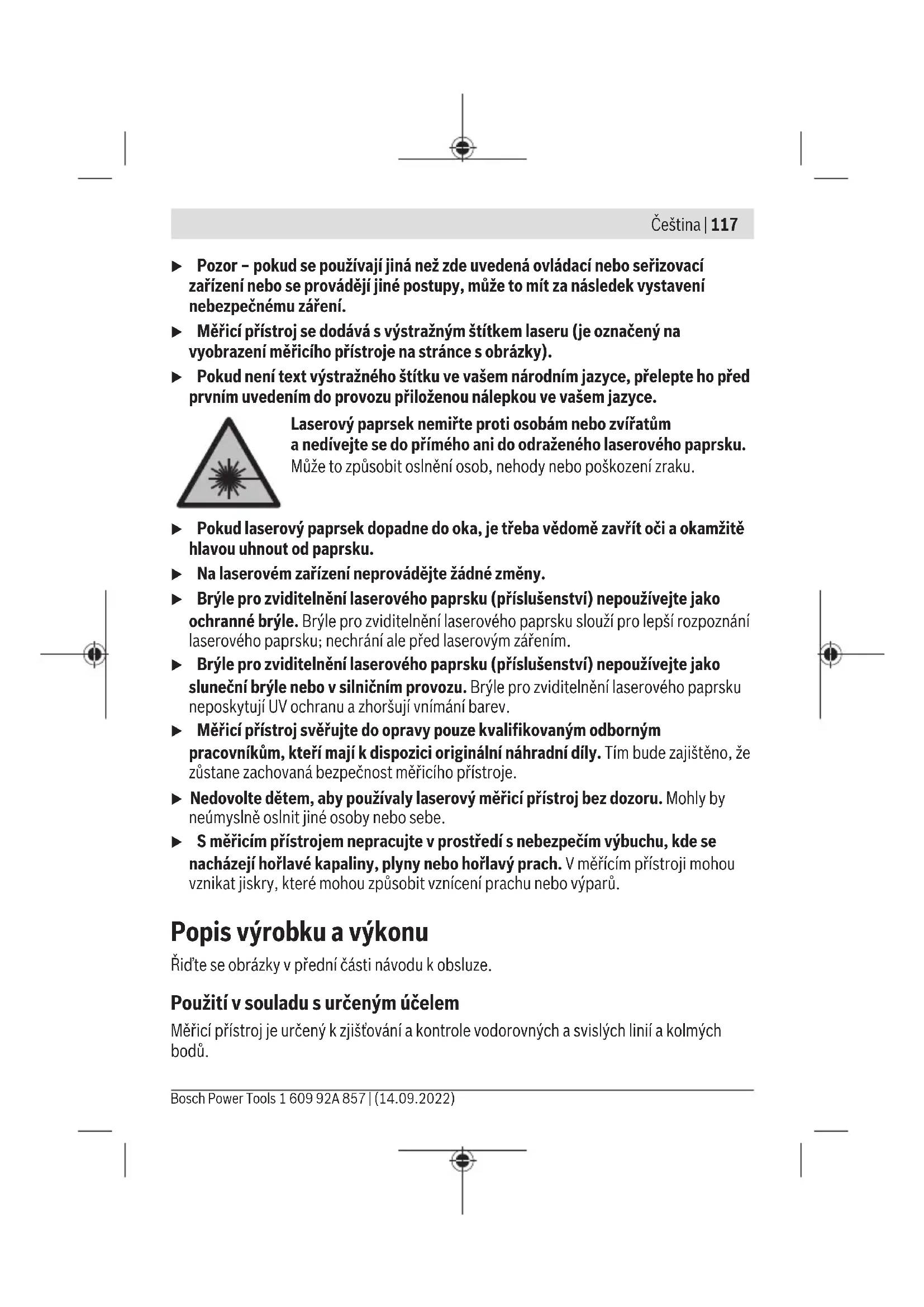 při 20–25°C C) Uvedené hodnoty platí za předpokladu normálních až příznivých podmínek prostředí (např. bez vibrací, bez mlhy, bez kouře, bez přímého slunečního záření). Po velkém kolísání teploty může dojít kodchylkám přesnosti. D) Vyskytuje se pouze nevodivé znečištění, přičemž příležitostně se ale očekává dočasná vodivost způsobená orosením. Kjednoznačné identifikaci měřicího přístroje slouží sériové číslo (6) na typovém štítku. Montáž Vložení/výměna baterií Pro provoz měřicího přístroje doporučujeme použít alkalicko-manganové baterie. Bosch Power Tools 1 609 92A 857 | (14.09.2022)120 | Čeština Pro otevření krytu přihrádky pro baterie(9) stiskněte aretaci(8) akryt přihrádky pro baterie sejměte. Vložte baterie. Přitom dodržujte správnou polaritu podle vyobrazení na vnitřní straně přihrádky baterie. Když jsou baterie slabé, rozsvítí se červeně výstraha baterie(4). Vždy vyměňujte všechny baterie současně. Používejte pouze baterie od jednoho výrobce ase stejnou kapacitou. u Když měřicí přístroj delší dobu nepoužíváte, vyjměte zněj baterie. Při delším skladování vměřicím přístroji mohou baterie zkorodovat asamy se vybít. Provoz Uvedení do provozu u Chraňte měřicí přístroj před vlhkem apřímým slunečním zářením. u Nevystavujte měřicí přístroj extrémním teplotám nebo kolísání teplot. Nenechávejte ho např. delší dobu ležet vautě. Při větším kolísání teplot nechte měřicí přístroj nejprve vytemperovat, než ho uvedete do provozu. Při extrémních teplotách nebo teplotních výkyvech může být omezena přesnost přístroje. u Chraňte měřicí přístroj před prudkými nárazy nebo pádem. Poškození měřicího přístroje může negativně ovlivnit přesnost. Po prudkém nárazu nebo pádu porovnejte laserovou čáru pro kontrolu se známou vodorovnou nebo svislou referenční linií. u Před přepravou měřicí přístroj vypněte. Při vypnutí se kyvná jednotka zajistí, při prudkých pohybech se jinak může poškodit. Zapnutí avypnutí Pro zapnutí měřicího přístroje posuňte vypínač (2) do polohy On. Měřicí přístroj promítá ihned po zapnutí zvýstupních otvorů (1) laserové paprsky. u Nemiřte laserový paprsek na osoby nebo zvířata anedívejte se sami do něj, ato ani zvětší vzdálenosti. Pro vypnutí měřicího přístroje posuňte vypínač (2) do polohy Off. Při vypnutí se zablokuje kyvadlová jednotka. u Nenechávejte zapnutý měřicí přístroj bez dozoru apo použití ho vypněte. Mohlo by dojít koslnění jiných osob laserovým paprskem. Druhy provozu Měřicí přístroj má tři druhy provozu, mezi kterými můžete kdykoli přecházet: 1 609 92A 857 | (14.09.2022) Bosch Power ToolsČeština | 121 Druh provozu Provoz skřížovými čárami sautomatickou nivelací (viz obrázekA): Měřicí přístroj promítá jednu vodorovnou ajednu svislou laserovou čáru. Provoz skřížovými čárami akolmým bodem sautomatickou nivelací (viz obrázekB): Měřicí přístroj promítá jednu vodorovnou advě svislé laserové čáry ajeden kolmý bod dolů. Dvě svislé laserové čáry probíhají tak, že svírají pravý úhel. Provoz skřížovými čárami sfunkcí sklonu (viz obrázekC): Měřicí přístroj promítá jednu vodorovnou ajednu svislou laserovou čáru. Po zapnutí se měřicí přístroj nachází vprovozu skřížovými čárami sautomatickou nivelací. Pro změnu druhu provozu stiskněte tlačítko druhu provozu laseru (3) tolikrát, dokud není indikován požadovaný druh provozu rozsvícením příslušného ukazatele druhu provozu(5). Automatická nivelace Práce sautomatickou nivelací Postavte měřicí přístroj na pevný vodorovný podklad nebo ho upevněte na stativ(11). Zvolte jeden zdruhů provozu sautomatickou nivelací. Automatická nivelace automaticky vyrovná nerovnosti vsamonivelačním rozsahu ±4°. Nivelace je ukončena, když se laserové čáry již nepohybují. Pokud není možná automatická nivelace, např. protože se plocha, na které měřicí přístroj stojí, odchyluje ovíce než 4° od vodorovné roviny, laser se vypne. Vtakovém případě postavte měřicí přístroj vodorovně apočkejte na samonivelaci. Při otřesech nebo změnách polohy během provozu se měřicí přístroj opět automaticky zniveluje. Po nivelaci zkontrolujte polohu laserových paprsků ve vztahu kreferenčním bodům, aby se zamezilo chybám daným posunutím měřícího přístroje. Práce sfunkcí sklonu Jako druh provozu zvolte provoz skřížovými čárami sfunkcí sklonu. Při práci sfunkcí sklonu je automatická nivelace vypnutá. Měřicí přístroj můžete držet vruce nebo postavit na podklad se sklonem. Laserové paprsky nejsou znivelované anemusí nutně probíhat kolmo. Pracovní pokyny u Pro označení používejte vždy pouze střed laserového bodu, resp. laserové čáry. Velikost laserového bodu resp. šířka laserové přímky se mění se vzdáleností. Bosch Power Tools 1 609 92A 857 | (14.09.2022)122 | Čeština Práce se stativem (příslušenství) Stativ poskytuje stabilní, výškově přestavitelný měřicí základ. Nasaďte měřicí přístroj 1/4" stativovým závitem (10) na závit stativu (11) nebo běžného fotografického stativu. Pomocí zajišťovacího šroubu stativu měřicí přístroj přišroubujte. Než zapnete měřicí přístroj, stativ nahrubo vyrovnejte. Brýle pro práci slaserem (příslušenství) Brýle pro práci slaserem odfiltrují okolní světlo. Tím se jeví světlo laseru světlejší pro oko. u Brýle pro zviditelnění laserového paprsku (příslušenství) nepoužívejte jako ochranné brýle. Brýle pro zviditelnění laserového paprsku slouží pro lepší rozpoznání laserového paprsku; nechrání ale před laserovým zářením. u Brýle pro zvid