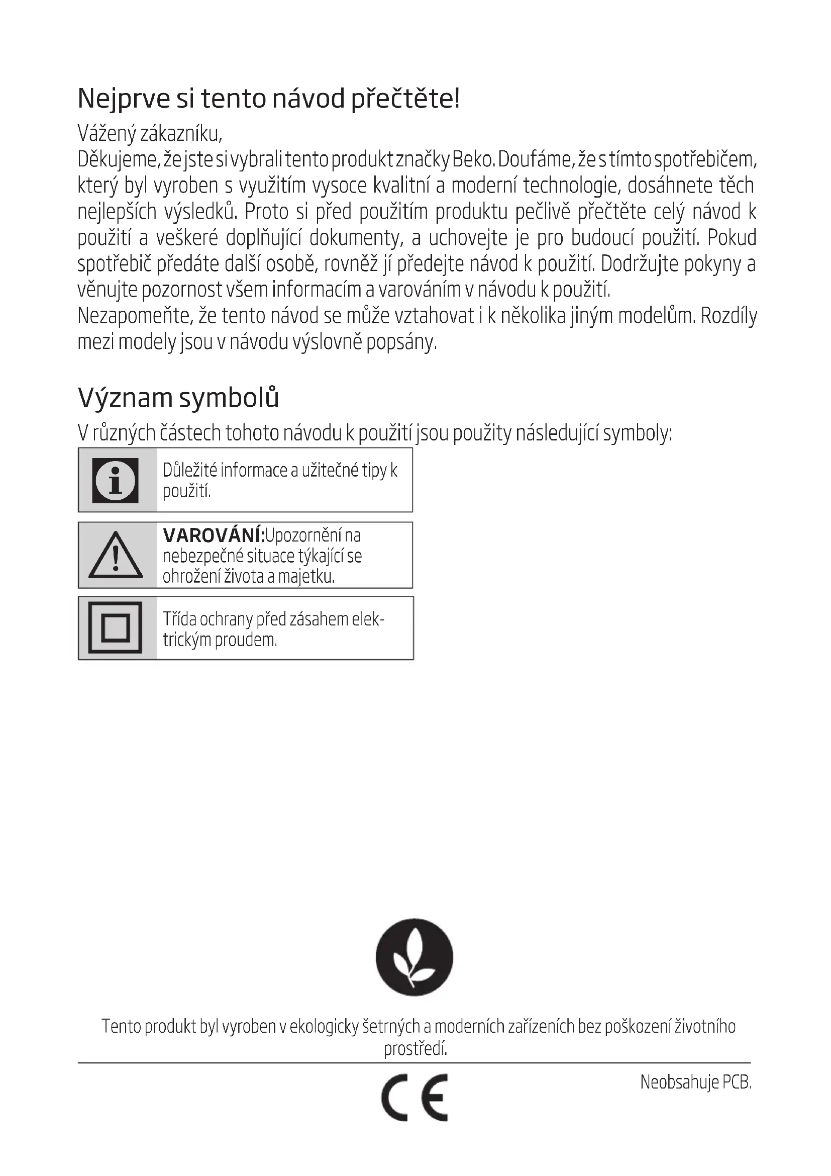 - Att tappa apparaten kan göra den icke-operativ eller orsaka permanenta skador. 4 Rengöring och skötselNejprve si tento návod přečtěte! Vážený zákazníku, Děkujeme, že jste si vybrali tento produkt značky Beko. Doufáme, že s tímto spotřebičem, který byl vyroben s využitím vysoce kvalitní a moderní technologie, dosáhnete těch nejlepších výsledků. Proto si před použitím produktu pečlivě přečtěte celý návod k použití a veškeré doplňující dokumenty, a uchovejte je pro budoucí použití. Pokud spotřebič předáte další osobě, rovněž jí předejte návod k použití. Dodržujte pokyny a věnujte pozornost všem informacím a varováním v návodu k použití. Nezapomeňte, že tento návod se může vztahovat i k několika jiným modelům. Rozdíly mezi modely jsou v návodu výslovně popsány. Význam symbolů V různých částech tohoto návodu k použití jsou použity následující symboly: