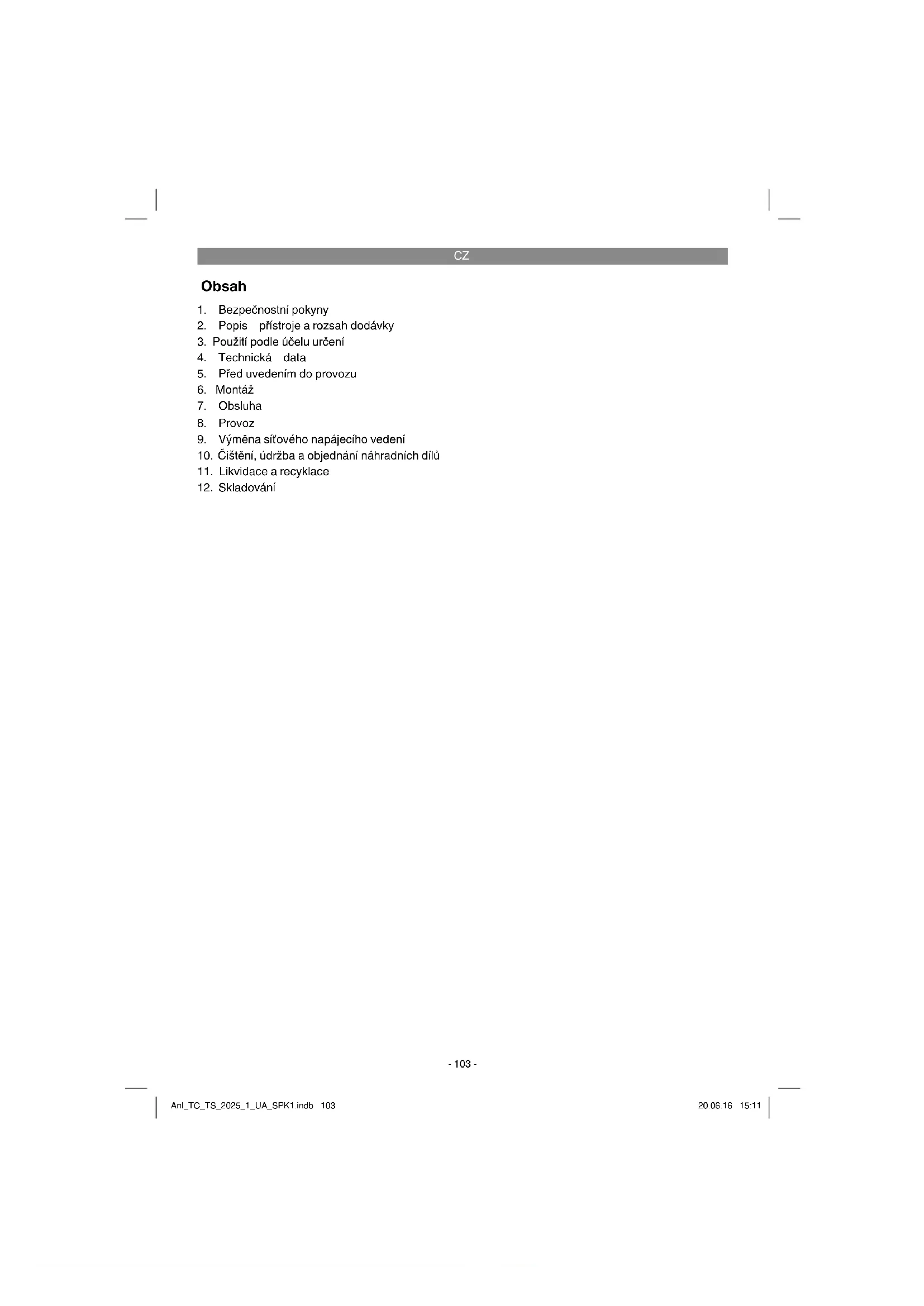 Skladujte přístroj a jeho příslušenství na tmavém, suchém a nezamrzajícím místě a mimo dosah dětí. Optimální teplota skladování leží mezi 5 a 30 ˚C. Uložte elektrický přístroj v originálním balení. Anl_TC_TS_2025_1_UA_SPK1.indb 111Anl_TC_TS_2025_1_UA_SPK1.indb 111 20.06.16 15:1120.06.16 15:11CZ