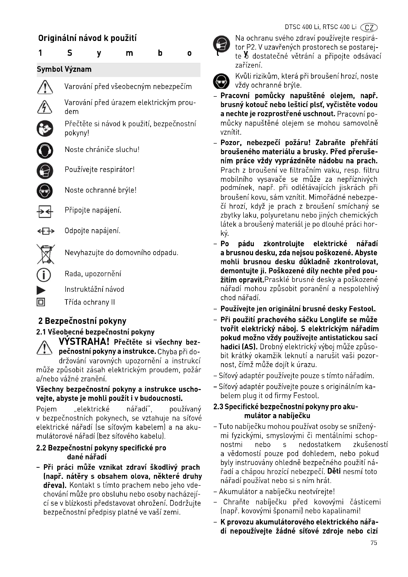 K provozu akumulátorového elektrického nářa- dí nepoužívejte žádné síťové zdroje nebo cizí Symbol Význam Varování před všeobecným nebezpečím Varování před úrazem elektrickým prou- dem Přečtěte si návod k použití, bezpečnostní pokyny! Noste chrániče sluchu! Používejte respirátor! Noste ochranné brýle! Připojte napájení. Odpojte napájení. Nevyhazujte do domovního odpadu. Rada, upozornění Instruktážní návod Třída ochrany II76 DTSC 400 Li, RTSC 400 Li