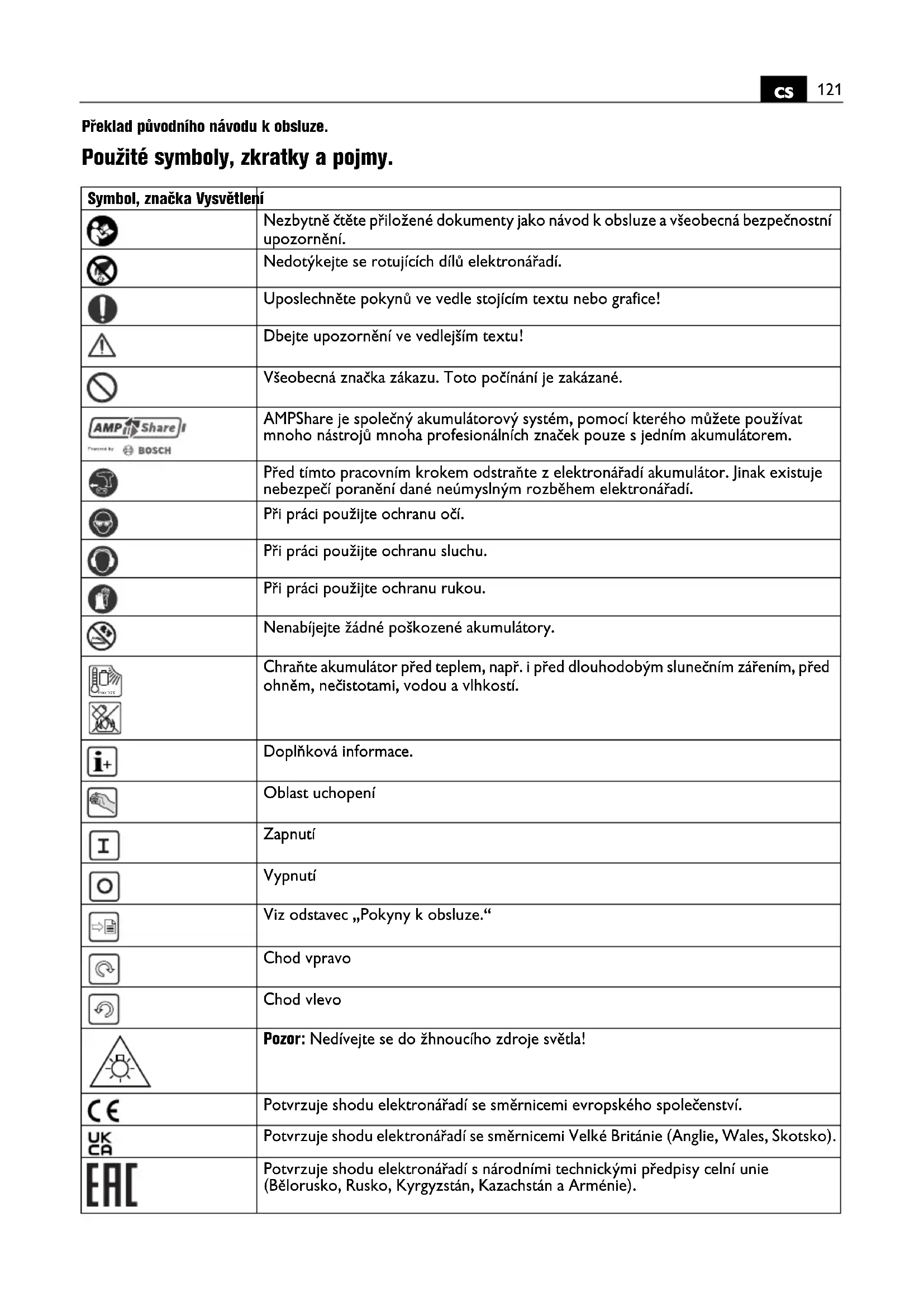 | CE | Potvrzuje shodu elektrónářadí se směrnicemi evropského spelečenství. |