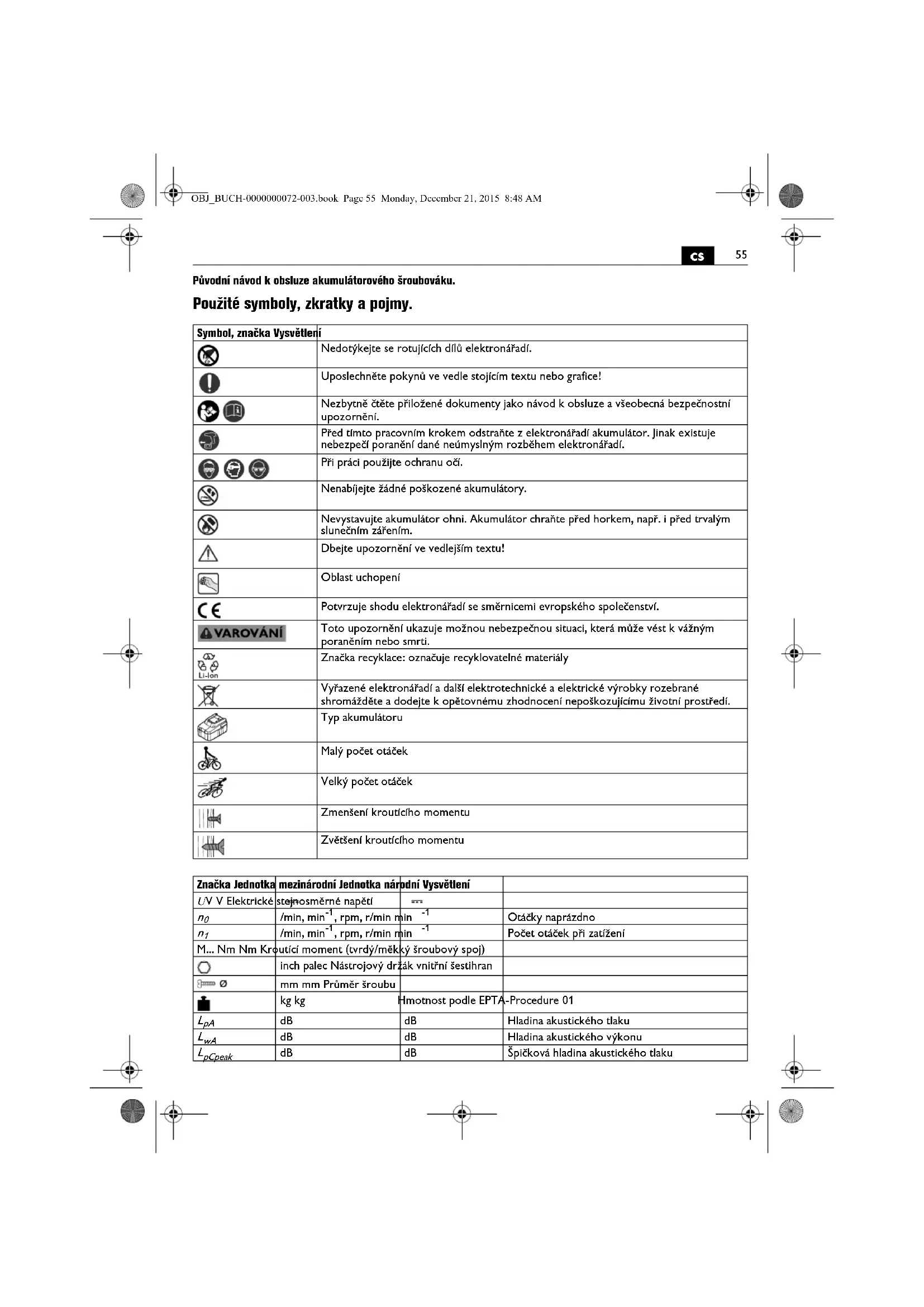 Původní návod k obsluze akumulátorového šroubováku. Použité symboly, zkratky a pojmy. Symbol, značka Vysvětlení Nedotýkejte se rotujících dílů elektronářadí. Uposlechněte pokynů ve vedle stojícím textu nebo grafice! Nezbytně čtěte přiložené dokumenty jako návod k obsluze a všeobecná bezpečnostní upozornění. Před tímto pracovním krokem odstraňte z elektronářadí akumulátor. Jinak existuje nebezpečí poranění dané neúmyslným rozběhem elektronářadí. Při práci použijte ochranu očí. Nenabíjejte žádné poškozené akumulátory. Nevystavujte akumulátor ohni. Akumulátor chraňte před horkem, např. i před trvalým slunečním zářením. Dbejte upozornění ve vedlejším textu! Oblast uchopení Potvrzuje shodu elektronářadí se směrnicemi evropského společenství. Toto upozornění ukazuje možnou nebezpečnou situaci, která může vést k vážným poraněním nebo smrti. Značka recyklace: označuje recyklovatelné materiály Vyřazené elektronářadí a další elektrotechnické a elektrické výrobky rozebrané shromážděte a dodejte k opětovnému zhodnocení nepoškozujícímu životní prostředí. Typ akumulátoru Malý počet otáček Velký počet otáček Zmenšení kroutícího momentu Zvětšení kroutícího momentu Značka Jednotka mezinárodní Jednotka národní Vysvětlení U V V Elektrické stejnosměrné napětí