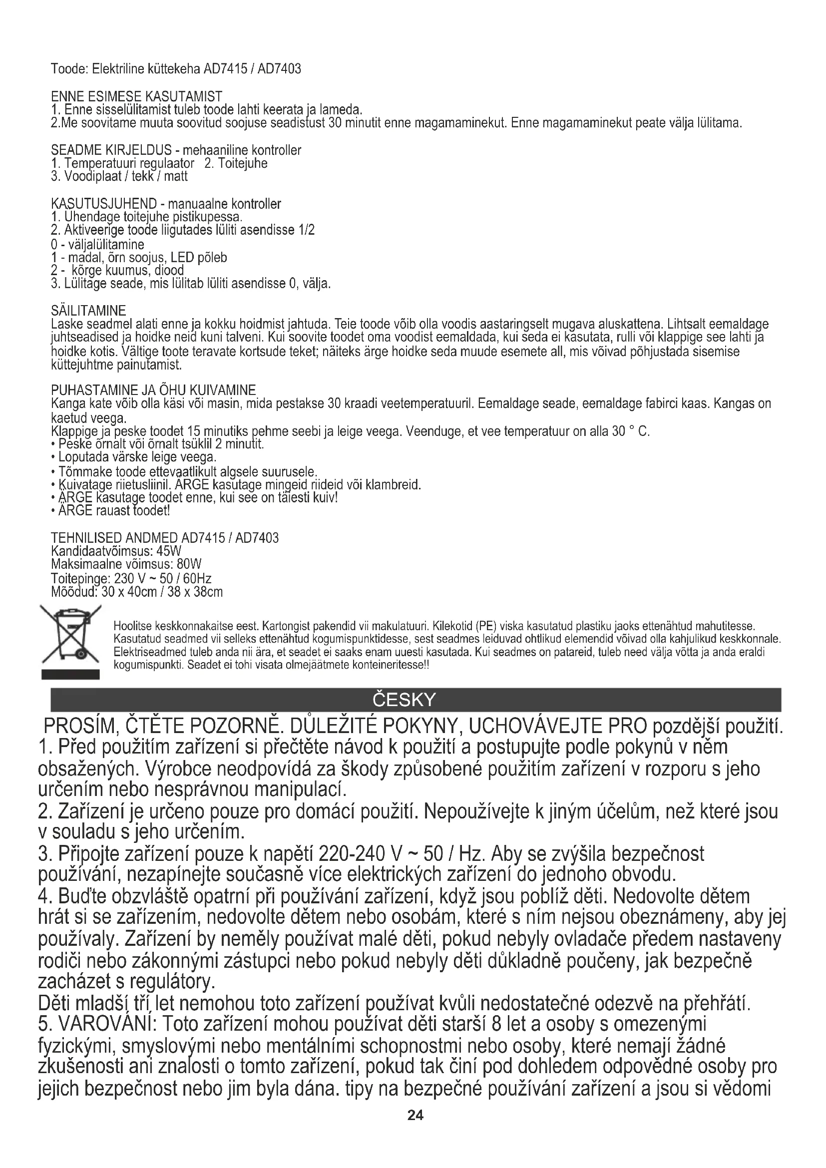 Produkt: Elektrická topná podložka AD7415 / AD7403 PŘED PRVNÍM POUŽITÍM