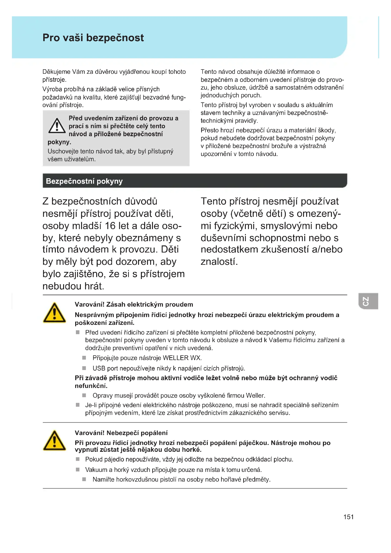 Děkujeme Vám za důvěrou vyjádřenou koupí tohoto přístroje. Výroba probíhá na základě velice přísných požadavků na kvalitu, které zajišťují bezvadné fung- ování přístroje. Před uvedením zařízení do provozu a prací s ním si přečtěte celý tento návod a přiložené bezpečnostní pokyny. Uschovejte tento návod tak, aby byl přístupný všem uživatelům. Tento návod obsahuje důležité informace o bezpečném a odborném uvedení přístroje do provo- zu, jeho obsluze, údržbě a samostatném odstranění jednoduchých poruch. Tento přístroj byl vyroben v souladu s aktuálním stavem techniky a uznávanými bezpečnostně- technickými pravidly. Přesto hrozí nebezpečí úrazu a materiální škody, pokud nebudete dodržovat bezpečnostní pokyny v přiložené bezpečnostní brožuře a výstražná upozornění v tomto návodu. Bezpečnostní pokyny Z bezpečnostních důvodů nesmějí přístroj používat děti, osoby mladší 16 let a dále oso- by, které nebyly obeznámeny s tímto návodem k provozu. Děti by měly být pod dozorem, aby bylo zajištěno, že si s přístrojem nebudou hrát. Tento přístroj nesmějí používat osoby (včetně dětí) s omezený- mi fyzickými, smyslovými nebo duševními schopnostmi nebo s nedostatkem zkušeností a/nebo znalostí. Varování! Zásah elektrickým proudem Nesprávným připojením řídicí jednotky hrozí nebezpečí úrazu elektrickým proudem a poškození zařízení. Před uvedení řídicího zařízení si přečtěte kompletní přiložené bezpečnostní pokyny, bezpečnostní pokyny uveden v tomto návodu k obsluze a návod k Vašemu řídicímu zařízení a dodržujte preventivní opatření v nich uvedená. Připojujte pouze nástroje WELLER WX. USB port nepoužívejte nikdy k napájení cizích přístrojů. Při závadě přístroje mohou aktivní vodiče ležet volně nebo může být ochranný vodič nefunkční. Opravy musejí provádět pouze osoby vyškolené rmou Weller. Je-li přípojné vedení elektrického nástroje poškozeno, musí se nahradit speciálně seřízením přípojným vedením, které lze získat prostřednictvím zákaznického servisu. Varování! Nebezpečí popálení Při provozu řídicí jednotky hrozí nebezpečí popálení páječkou. Nástroje mohou po vypnutí zůstat ještě nějakou dobu horké. Pokud pájedlo nepoužíváte, vždy jej odložte na bezpečnou odkládací plochu. Vakuum a horký vzduch připojujte pouze na místa k tomu určená. Namiřte horkovzdušnou pistolí na osoby nebo hořlavé předměty. Pro vaši bezpečnost152