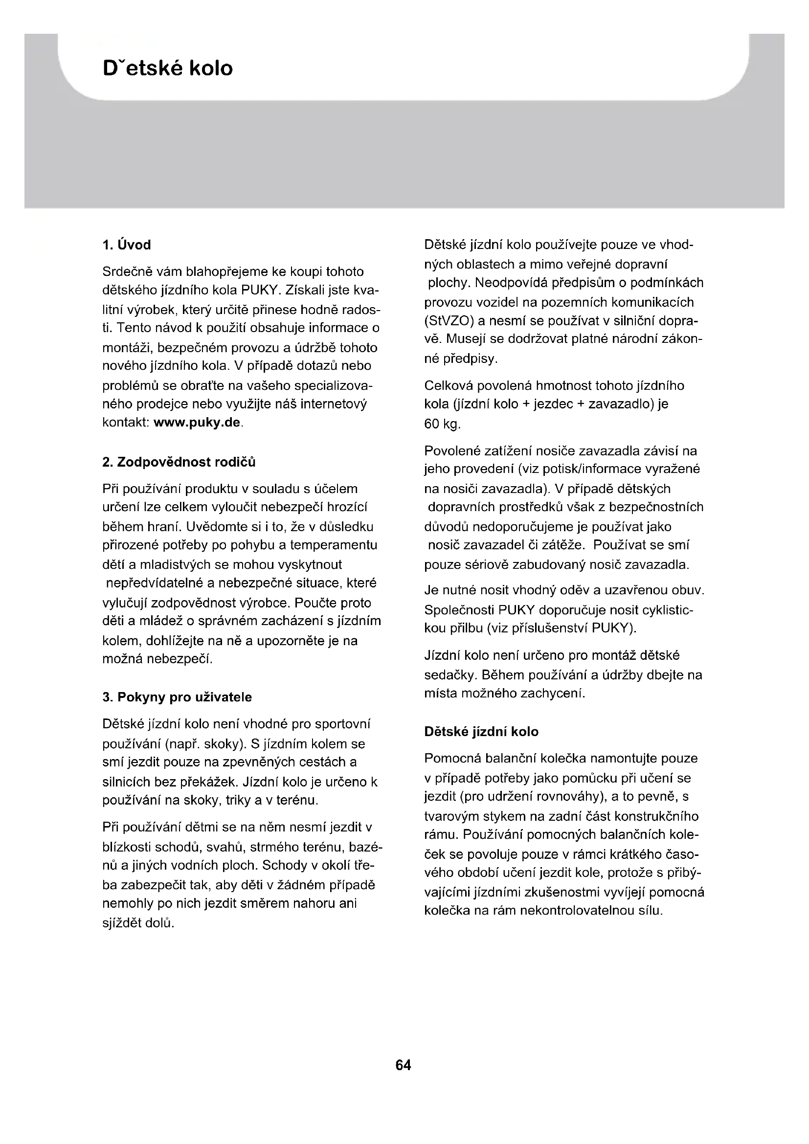 Srdečné vám blahopřejeme ke koupi tohoto dětského jízdniho kola PUKY. Získali jste kvalitní vyrobek, který určité prinese hodné radosti. Tento námod k použiti obsahuje informace o montáži, bezpečném provozu a udrzbe tohoto nového jízdniho kola. V pripadě dotazu nebo problémů se obrattte na vaseho specializováneho prodejce nebo vyuzijte nás internetový kontakt: www.puky.de.