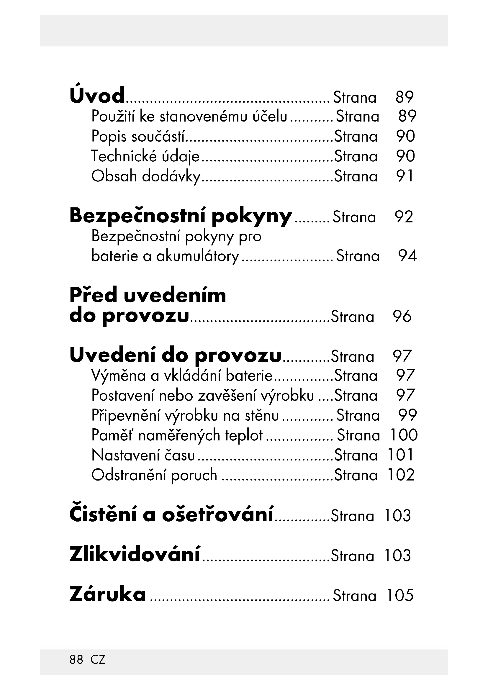 Technické údaje Provozní napětí: 1,5 V (stej- nosměrný proud)91 CZ Napájecí napětí: 1 x baterie 1,5 V (stejnosměrný proud) AAA (v ob- sahu dodávky) Teplotní rozsah: uvnitř: od –10 °C do +40 °C venku: od –40 °C do +60 °C Venkovní čidlo: IP44 (chráněné proti stříkající vodě) Kabel venkovního čidla: cca 2,8 m LC displej: 21 x 50 mm (šířka x výška)