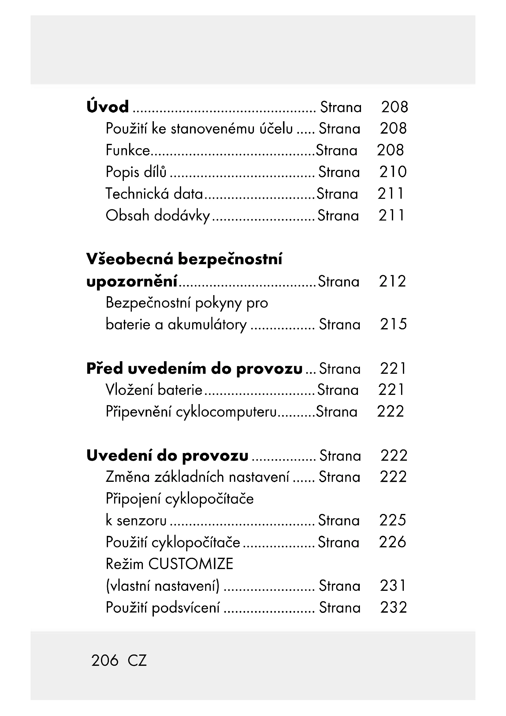 Použití cyklopočitače......... Strana 226