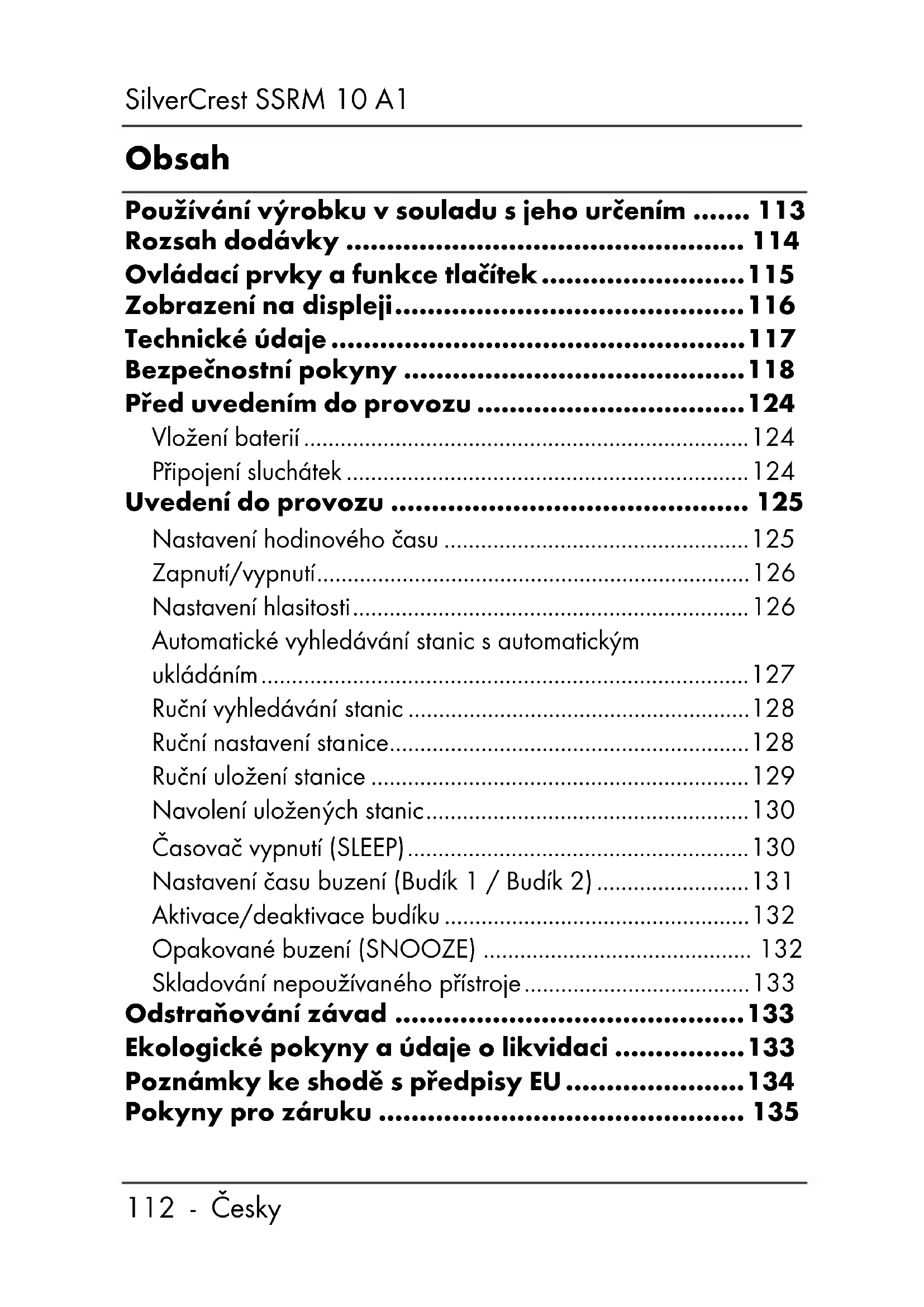 - Pokyny pro záruku SilverCrest SSRM10 A1 Česky - 113 Srdečně blahopřejeme! Zakoupením FM rádia SilverCrest SSRM 10 A1, dále označovaného jako rádio, jste se rozhodli pro vysoce kvalitní výrobek. Před prvním uvedením do provozu se s rádiem seznamte a pozorně si přečtěte tento návod k obsluze. Dodržujte především bezpečnostní pokyny a používejte rádio jen tak, jak je popsáno v tomto návodu k obsluze, a jen pro uvedené oblasti použití. Tento návod k obsluze dobře uschovejte. Při předání rádia dalším osobám nezapomeňte předat i veškeré podklady. Používání výrobku v souladu s jeho určením Tento přístroj je výrobkem spotřební elektroniky a slouží k příjmu rádiových stanic nebo jako budík. Smí být používán pouze k soukromým, nikoli k průmyslovým či komerčním účelům. Přístroj se dále nesmí používat v tropických klimatických oblastech. Používejte pouze připojovací kabely a externí zařízení, která co do technické bezpečnosti, elektromagnetické kompatibility a kvality stínění odpovídají tomuto přístroji. Tento přístroj splňuje všechny normy a směrnice uvedené v prohlášení o shodě. Při změně přístroje neodsouhlasené výrobcem nelze dodržení těchto norem nadále zaručit. Za takto vzniklé škody nebo poruchySilverCrest SSRM 10 A1 p. 135