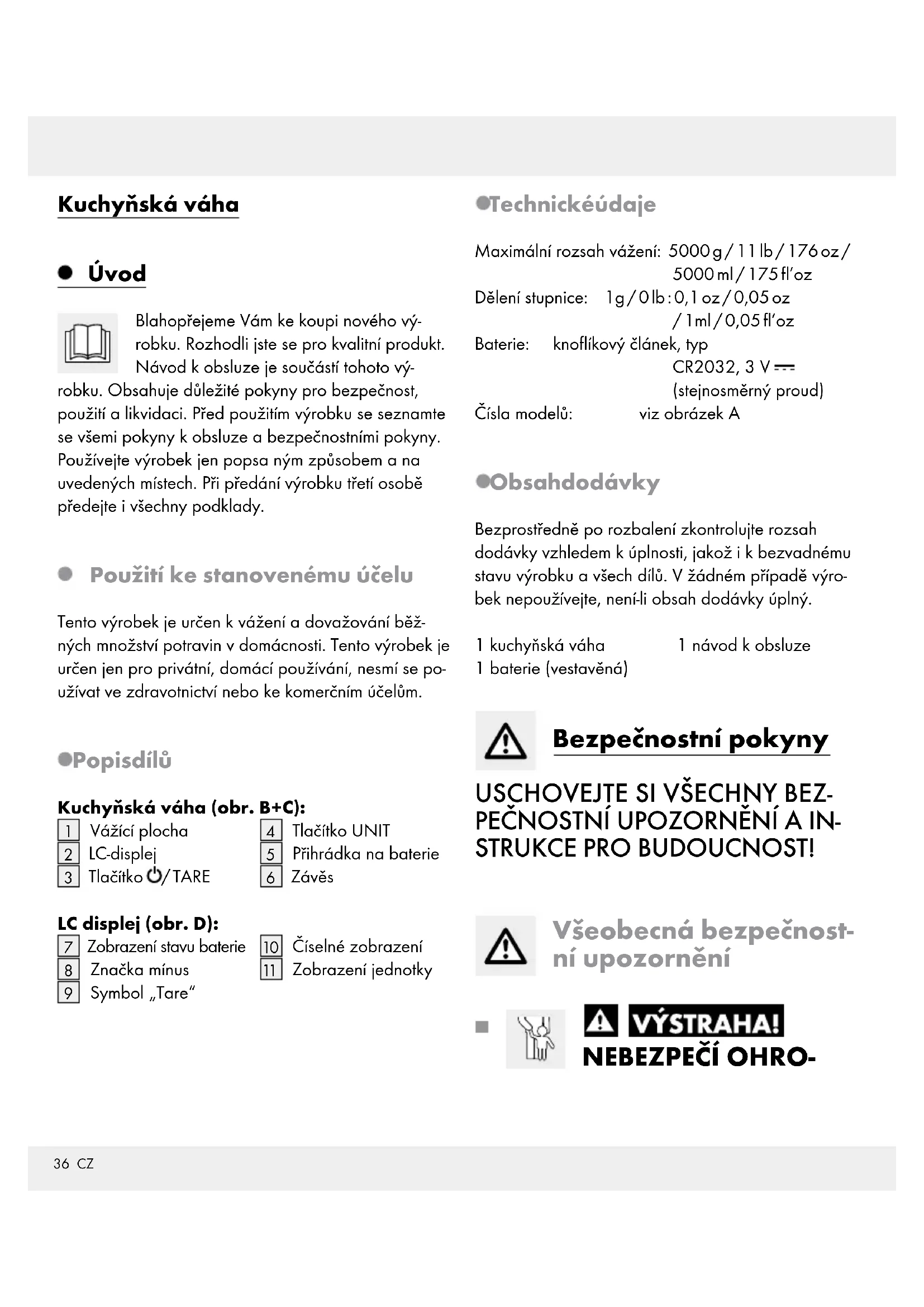 Zobrazení jednotky Technické údaje Maximální rozsah vážení: 5000 g / 11 lb / 176 oz / 5000 ml / 175 fl’oz Dělení stupnice: 1g / 0 lb : 0,1 oz / 0,05 oz / 1ml / 0,05 fl’oz Baterie: knoflíkový článek, typ CR2032, 3 V (stejnosměrný proud) Čísla modelů: viz obrázek A Obsah dodávky Bezprostředně po rozbalení zkontrolujte rozsah dodávky vzhledem kúplnosti, jakož i kbezvadnému stavu výrobku a všech dílů. V žádném případě výro- bek nepoužívejte, není-li obsah dodávky úplný. 1 kuchyňská váha 1 baterie (vestavěná) 1 návod kobsluze Bezpečnostní pokyny