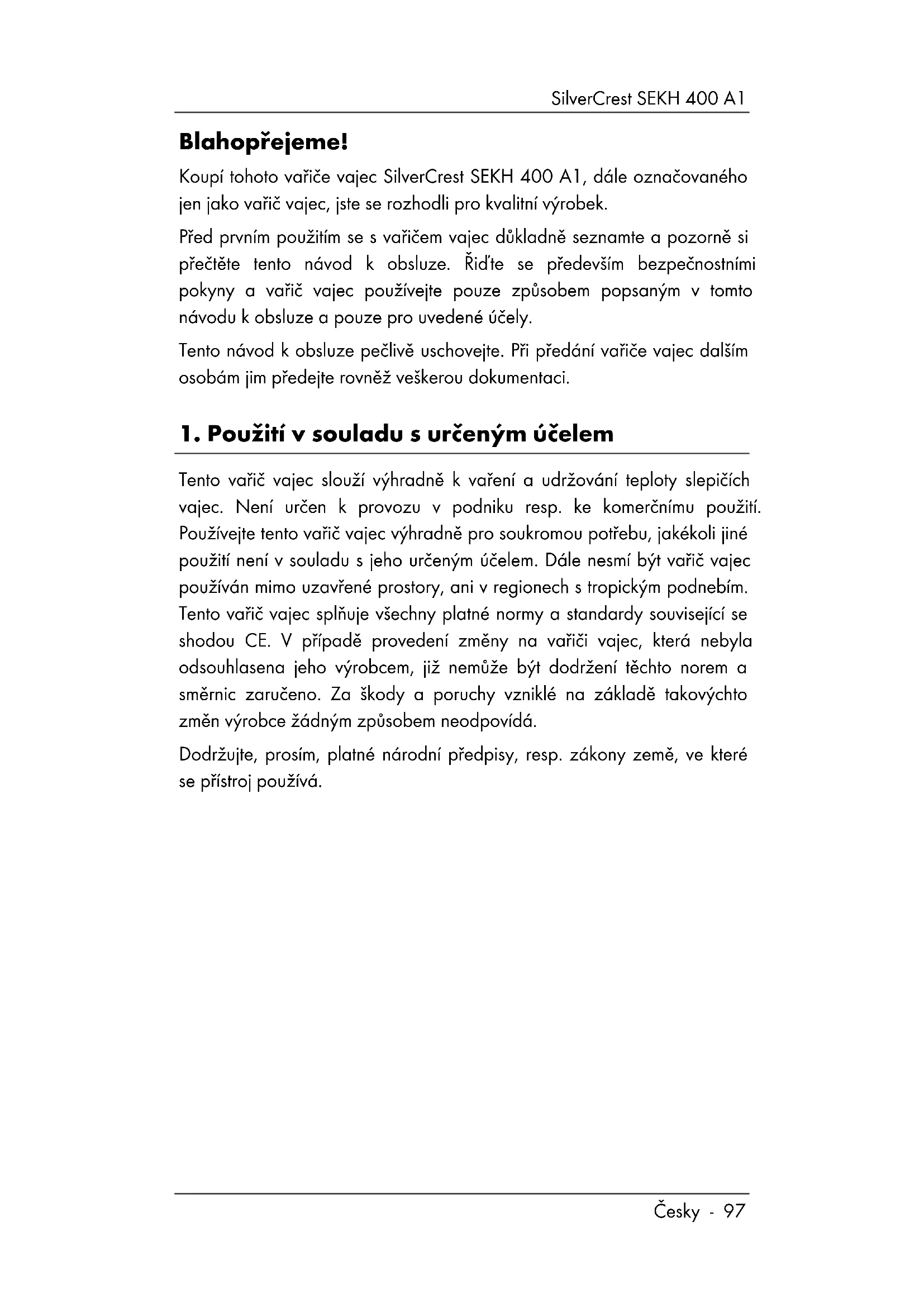 Tento varic vajec slouzi vyhradne k vaeni a udrzovani teploty slepiich vajec. Nenir ucran k provozu v podniku resp. ke komercnimu pouziti. Pouziveje tento varic vajec vyhradne pro sukromou potrebu, jakekoli jiné pouziti nenir v souladus jeho urcenym ucelem. Dale nesmi byt varic vajec pouzivan mimo uzavrené prostory, ani v regionech s tropickym podnebim. Tento varic vajec splnjuve vsechny platne normy a standardy souvisejici se shodou CE. V priade provedenizmey na varici vajec, ktera nebyla odsouhlasena jeho vyrobcem, již nemuze byt dodrzeni tchto norem a smernic zaruceno. Za skody a poruchy vznikle na zaklade takovychto zmen vyrobce zadnym zpusobem neodpovidá.