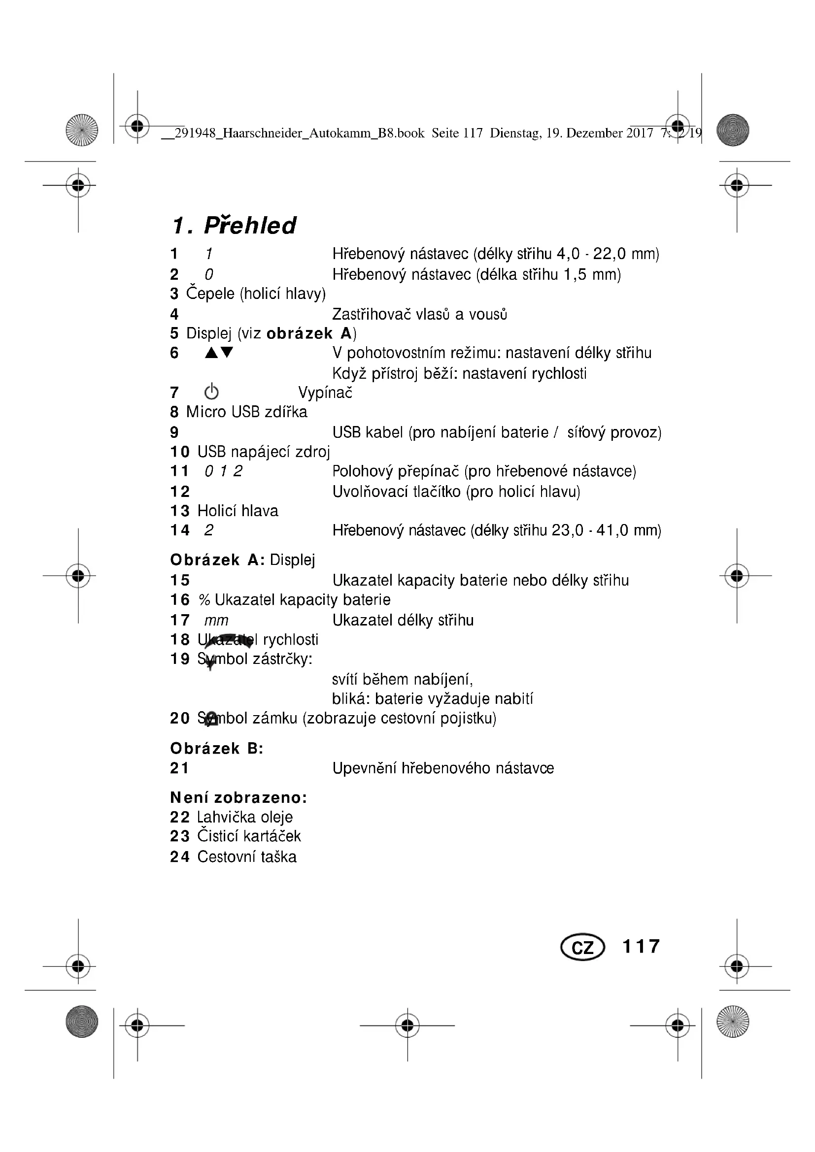 1zastįihovaê vlasŃ a vousŃ|4 3hįebenové nástavce: -Hįebenový nástavec 0 (délka stįihu 1,5 mm)|2 -Hįebenový nástavec 1 (délky stįihu 4,0 - 22,0 mm)|1 -Hįebenový nástavec 2 (délky stįihu 23,0 - 41,0 mm)|14 1 USB napájecí zdroj|10 1 USB kabel|9 1 êisticí kartáêek|23 1lahviêka oleje|22 1 cestovní taška|24 1 návod k použití __291948_Haarschneider_Autokamm_B8.book Seite 124 Dienstag, 19. Dezember 2017 7:42 19125