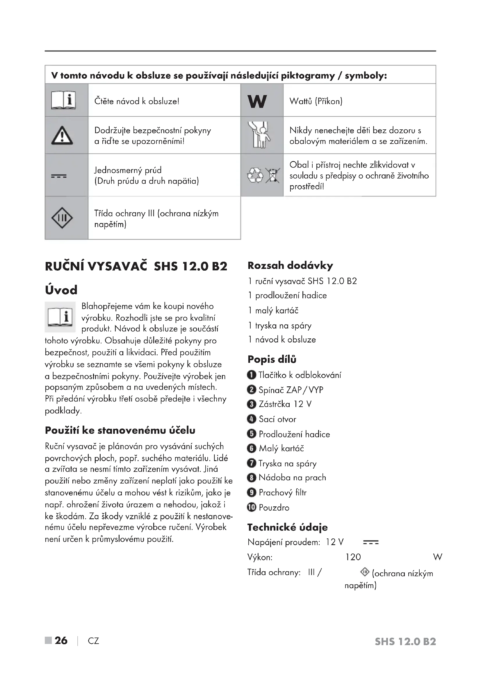 Úvod Blahopřejeme vám ke koupi nového výrobku. Rozhodli jste se pro kvalitní produkt. Návod kobsluze je součástí tohoto výrobku. Obsahuje důležité pokyny pro bezpečnost, použití a likvidaci. Před použitím výrobku se seznamte se všemi pokyny k obsluze a bezpečnostními pokyny. Používejte výrobek jen popsaným způsobem a na uvedených místech. Při předání výrobku třetí osobě předejte i všechny podklady. Použití ke stanovenému účelu Ruční vysavač je plánován pro vysávání suchých povrchových ploch, popř. suchého materiálu. Lidé a zvířata se nesmí tímto zařízením vysávat. Jiná použití nebo změny zařízení neplatí jako použití ke stanovenému účelu a mohou vést k rizikům, jako je např. ohrožení života úrazem a nehodou, jakož i ke škodám. Za škody vzniklé z použití k nestanove- nému účelu nepřevezme výrobce ručení. Výrobek není určen k průmyslovému použití. Rozsah dodávky 1 ruční vysavač SHS 12.0 B2 1 prodloužení hadice 1 malý kartáč 1 tryska na spáry 1 návod kobsluze Popis dílů Tlačítko k odblokování Spínač ZAP / VYP Zástrčka 12 V Sací otvor Prodloužení hadice Malý kartáč Tryska na spáry Nádoba na prach Prachový filtr Pouzdro Technické údaje Napájení proudem: 12 V Výkon: 120 W Třída ochrany: III / (ochrana nízkým napětím) V tomto návodu k obsluze se používají následující piktogramy / symboly: Čtěte návod k obsluze!