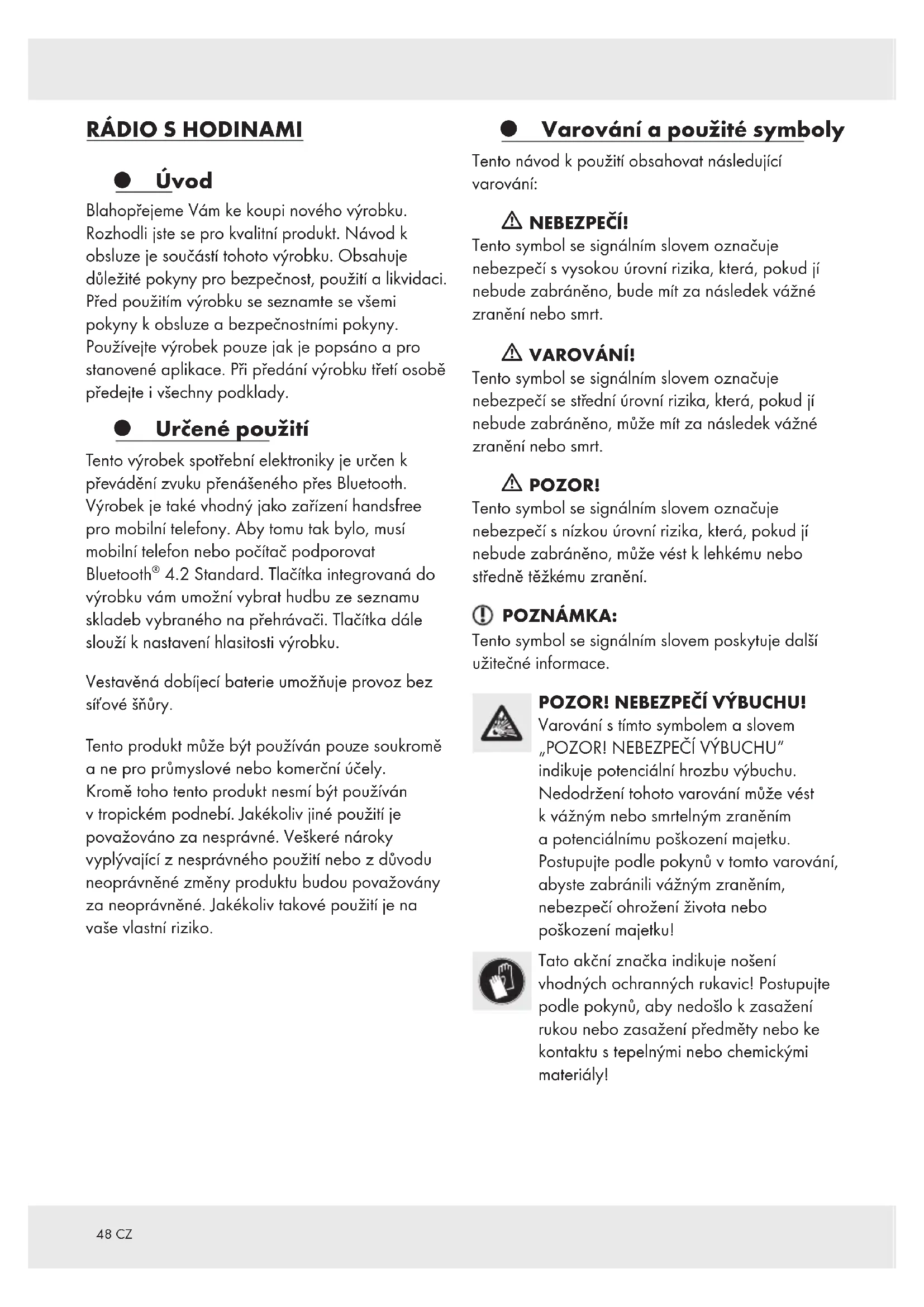 výrobku vám umožní vybrat hudbu ze seznamu skladeb vybraného na přehrávači. Tlačítka dále slouží k nastavení hlasitosti výrobku. Vestavěná dobíjecí baterie umožňuje provoz bez síťové šňůry. Tento produkt může být používán pouze soukromě a ne pro průmyslové nebo komerční účely. Kromě toho tento produkt nesmí být používán v tropickém podnebí. Jakékoliv jiné použití je považováno za nesprávné. Veškeré nároky vyplývající z nesprávného použití nebo z důvodu neoprávněné změny produktu budou považovány za neoprávněné. Jakékoliv takové použití je na vaše vlastní riziko. z Varování a použité symboly Tento návod k použití obsahovat následující varování: m NEBEZPEČÍ! Tento symbol se signálním slovem označuje nebezpečí s vysokou úrovní rizika, která, pokud jí nebude zabráněno, bude mít za následek vážné zranění nebo smrt. m VAROVÁNÍ! Tento symbol se signálním slovem označuje nebezpečí se střední úrovní rizika, která, pokud jí nebude zabráněno, může mít za následek vážné zranění nebo smrt. m POZOR! Tento symbol se signálním slovem označuje nebezpečí s nízkou úrovní rizika, která, pokud jí nebude zabráněno, může vést k lehkému nebo středně těžkému zranění. POZNÁMKA: Tento symbol se signálním slovem poskytuje další užitečné informace. POZOR! NEBEZPEČÍ VÝBUCHU! Varování s tímto symbolem a slovem
