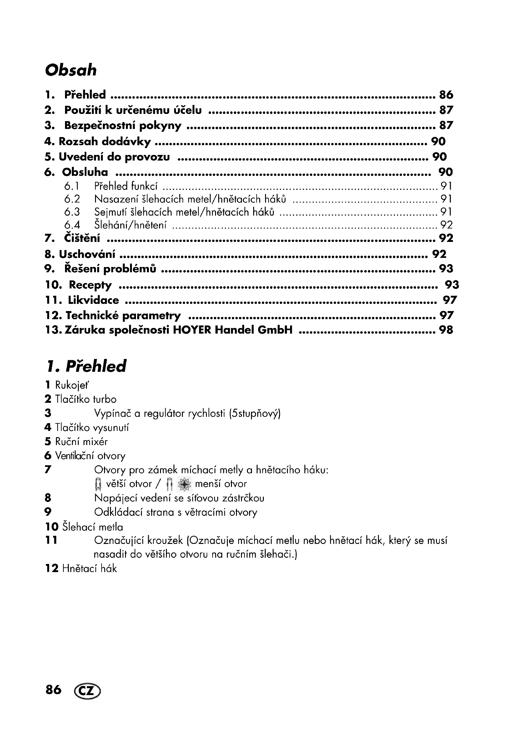1 Rukojeť 2 Tlačítko turbo 3 Vypínač a regulátor rychlosti (5stupňový) 4 Tlačítko vysunutí 5 Ruční mixér 6 Ventilační otvory 7 Otvory pro zámek míchací metly a hnětacího háku: větší otvor / menší otvor 8 Napájecí vedení se síťovou zástrčkou 9 Odkládací strana s větracími otvory 10 Šlehací metla 11 Označující kroužek (Označuje míchací metlu nebo hnětací hák, který se musí nasadit do většího otvoru na ručním šlehači.) 12 Hnětací hák __379021_2110_Handmixer_B8.book Seite 86 Mittwoch, 15. Dezember 2021 12:27 1287