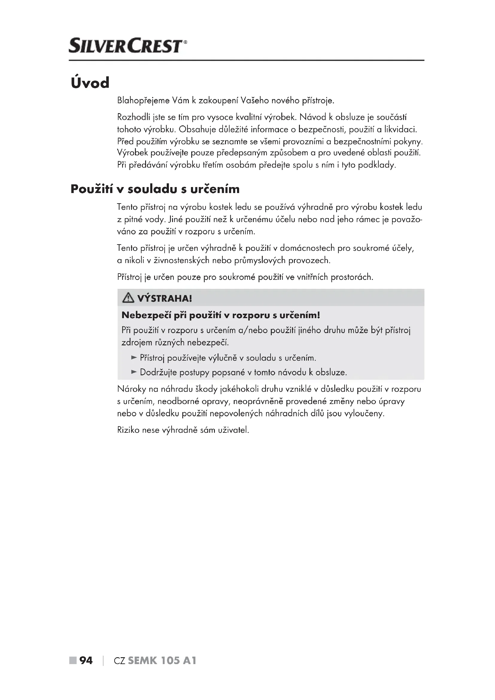 Tento přístroj na výrobu kostek ledu se používá výhradně pro výrobu kostek ledu z pitné vody. Jiné použití než k určenému účelu nebo nad jeho rámec je považováno za použití v rozporu s určením.
