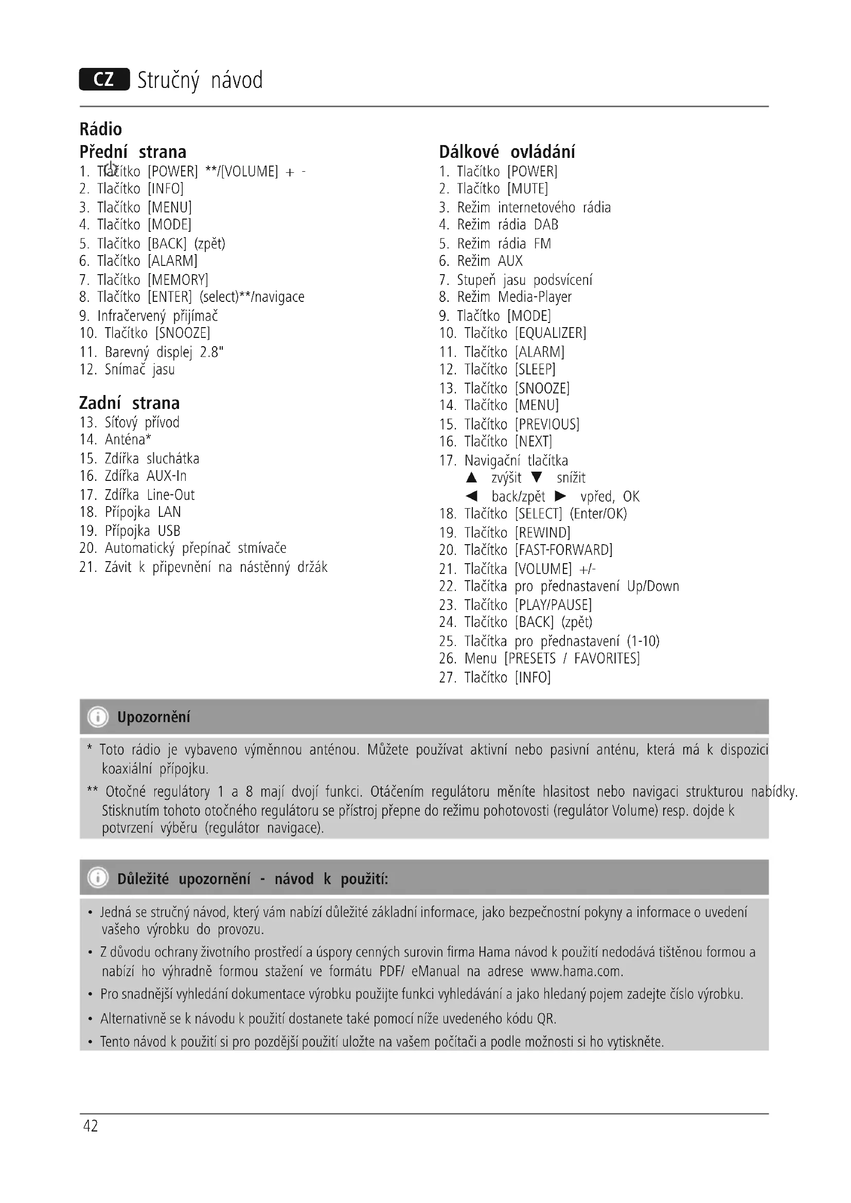 - Toto rádio je vybaveno výměnnou anténou. Můžete používat aktivní nebo pasivní anténu, která má k dispozici koaxiální přípojku. ** Otočné regulátory 1 a 8 mají dvojí funkci. Otáčením regulátoru měníte hlasitost nebo navigaci strukturou nabídky. Stisknutím tohoto otočného regulátoru se přístroj přepne do režimu pohotovosti (regulátor Volume) resp. dojde k potvrzení výběru (regulátor navigace). Důležité upozornění - návod k použití: