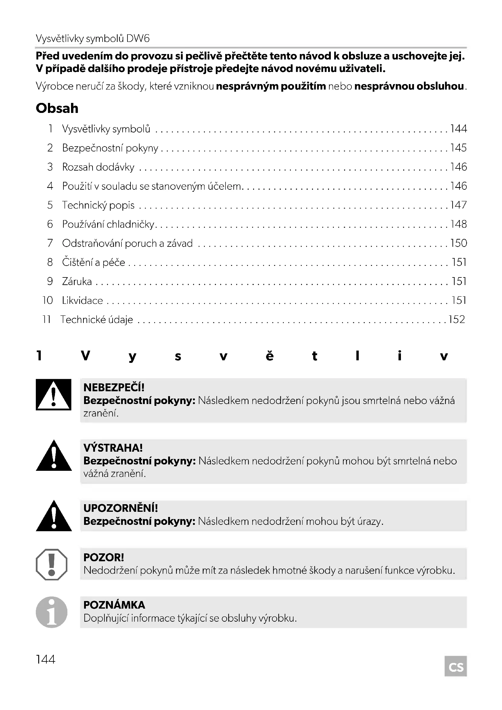 NEBEZPEČÍ! Bezpečnostní pokyny: Následkem nedodržení pokynů jsou smrtelná nebo vážná zranění. VÝSTRAHA! Bezpečnostní pokyny: Následkem nedodržení pokynů mohou být smrtelná nebo vážná zranění. UPOZORNĚNÍ! Bezpečnostní pokyny: Následkem nedodržení mohou být úrazy. POZOR! Nedodržení pokynů může mít za následek hmotné škody a narušení funkce výrobku. POZNÁMKA Doplňující informace týkající se obsluhy výrobku. DW6-O-16s.book Seite 144 Montag, 3. April 2017 4:04 16DW6 Bezpečnostní pokyny