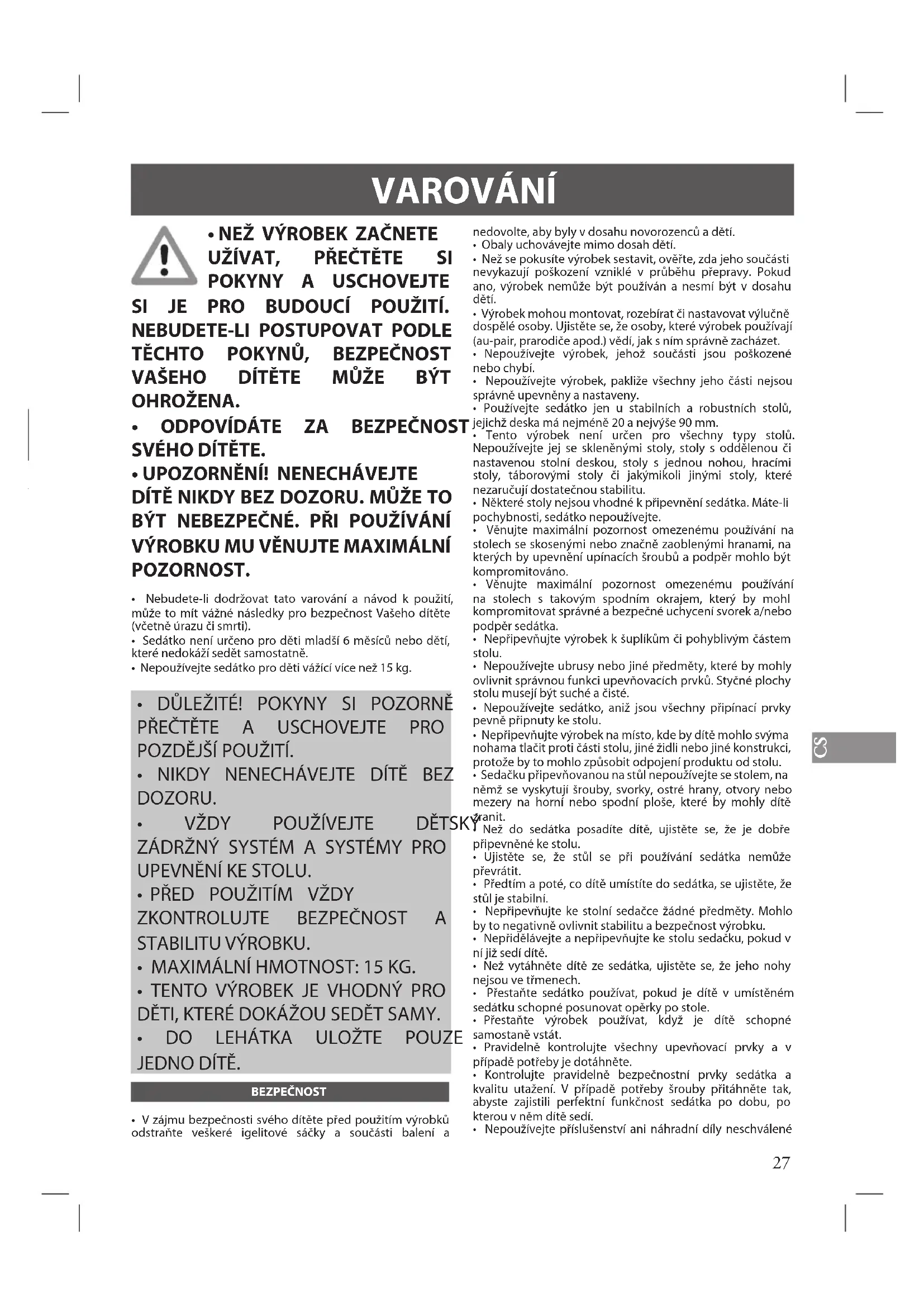 - Nebudete-li dodržovat tato varování a návod k použití, může to mít vážné následky pro bezpečnost Vašeho dítěte (včetně úrazu či smrti).