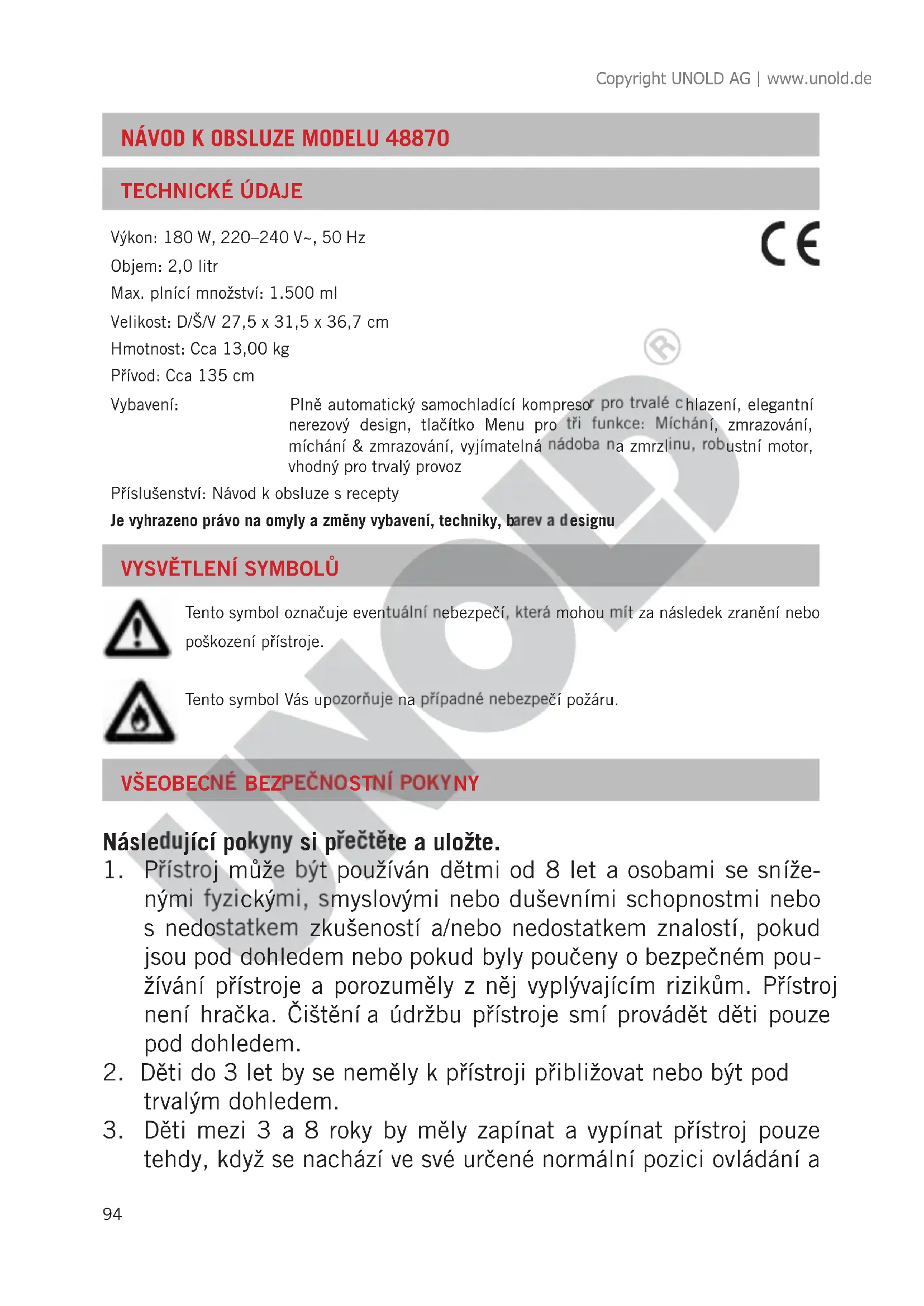 Tento symbol označuje eventuální nebezpečí, která mohou mít za následek zranění nebo poškození přístroje. Tento symbol Vás upozorňuje na případné nebezpečí požáru. Copyright UNOLD AG | www.unold.de95 když jsou pod dohledem nebo pokud byly poučeny o bezpečném používání přístroje a porozuměly z něj vyplývajícím rizikům. Děti mezi 3 a 8 roky by neměly přístroj ani připojovat ani ovládat, čis