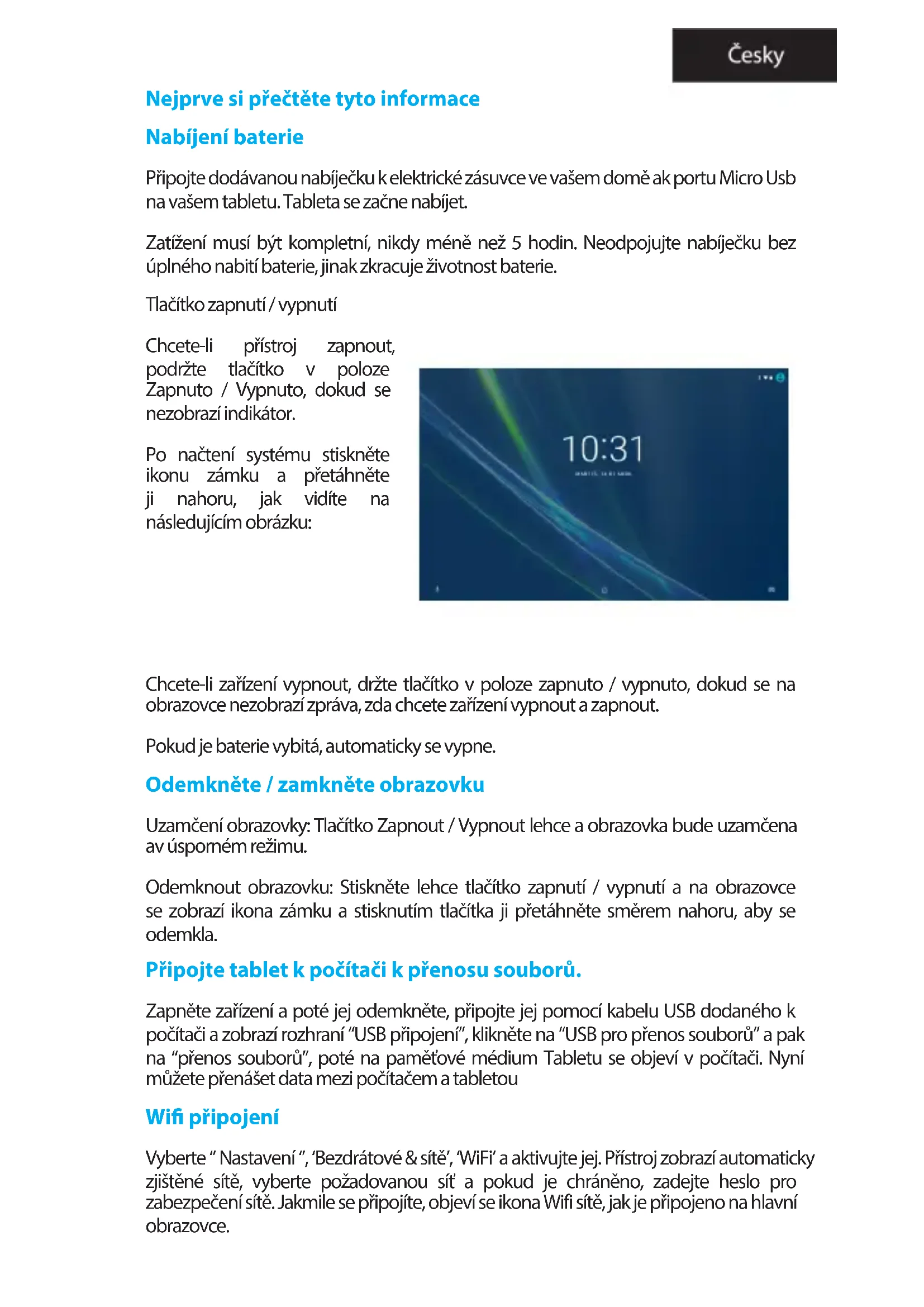 Nabíjení baterie Připojte dodávanou nabíječku k elektrické zásuvce ve vašem domě ak portu Micro Usb na vašem tabletu. Tableta se začne nabíjet. Zatížení musí být kompletní, nikdy méně než 5 hodin. Neodpojujte nabíječku bez úplného nabití baterie, jinak zkracuje životnost baterie. Tlačítko zapnutí / vypnutí Chcete-li přístroj zapnout, podržte tlačítko v poloze Zapnuto / Vypnuto, dokud se nezobrazí indikátor. Po načtení systému stiskněte ikonu zámku a přetáhněte ji nahoru, jak vidíte na následujícím obrázku: Chcete-li zařízení vypnout, držte tlačítko v poloze zapnuto / vypnuto, dokud se na obrazovce nezobrazí zpráva, zda chcete zařízení vypnout a zapnout. Pokud je baterie vybitá, automaticky se vypne. Odemkněte / zamkněte obrazovku Uzamčení obrazovky: Tlačítko Zapnout / Vypnout lehce a obrazovka bude uzamčena av úsporném režimu. Odemknout obrazovku: Stiskněte lehce tlačítko zapnutí / vypnutí a na obrazovce se zobrazí ikona zámku a stisknutím tlačítka ji přetáhněte směrem nahoru, aby se odemkla. Připojte tablet k počítači k přenosu souborů. Zapněte zařízení a poté jej odemkněte, připojte jej pomocí kabelu USB dodaného k počítači a zobrazí rozhraní “USB připojení”, klikněte na “USB pro přenos souborů” a pak na “přenos souborů”, poté na paměťové médium Tabletu se objeví v počítači. Nyní můžete přenášet data mezi počítačem a tabletou Wi připojení Vyberte ‘’ Nastavení ‘’, ‘Bezdrátové & sítě’, ‘WiFi’ a aktivujte jej. Přístroj zobrazí automaticky zjištěné sítě, vyberte požadovanou síť a pokud je chráněno, zadejte heslo pro zabezpečení sítě. Jakmile se připojíte, objeví se ikona Wifi sítě, jak je připojeno na hlavní obrazovce.Připojení Bluetooth Vyberte ‘’ Nastavení ‘’, ‘Bluetooth’ a aktivujte jej. Klikněte na položku Vyhledat zařízení, zobrazí se vám blízká zařízení Bluetooth, vyberte ji a automaticky se připojí. Karty SIM a Micro SD Vypněte Tablet, vyjměte horní kryt a vložte SIM kartu do slotu SIM1 nebo SIM2 a zapněte ji. (Pokud máte jinou kartu SIM, vložte ji do slotu SIM2). Chcete-li kartu zamknout, musíte zadat kód PIN. Pokud kód PIN zadáte nesprávně třikrát za sebou, karta SIM bude zablokována. V takovém případě musíte zadat kód PUK a odemknout kartu SIM. Chcete-li vložit kartu Micro SD, sejměte zadní horní kryt a vložte kartu Micro SD do slotu Tlačítko reset V případě zámku systému nebo bez odpovědi stiskněte tlačítko napájení, dokud se Tablet nevypne, a poté jej znovu zapněte. Recyklované AEE REI-RAEE 5548 V tomto návodu označuje symbol kontejneru (bin), že výrobek podléhá evropské směrnici 2002/96 / ES, elektrické a elektronické výrobky, baterie a baterie a další příslušenství musí být nutně předmětem selektivní sbírka. Po skončení životnosti zařízení použijte recyklační nádoby. Toto gesto pomůže snížit zdravotní rizika a zachovat životní prostředí. Obce a distributoři vám poskytnou základní informace o recyklaci vašeho starého zařízení.Tento přístroj nese interní baterii a musí být odstraněn a uložen zvlášť pro správnou správu. Technická podpora Další informace o instalaci a konfiguraci tohoto produktu naleznete na našich webových stránkách www.billowtechnology.com.Einleitung und Produktbeschreibung Vielen Dank für die Auswahl der Tablette X103x Das Tablet X103x verfügt über eine HD-Panel mit 1280 * 800 Auflösung, Quad-Core Prozessor, 1 GB DDR3 Speicher, 5MP Frontkamera und 8MP hintere Kamera, 16GB interner Speicher, GPS, Bluetooth 4.0, 3G, all dies so, dass Sie können auf dem Netz alle Ihre Fotos, Videos, Musik und endlosen Multimedia-Inhalte mit unvorstellbaren Geschwindigkeiten genießen, dank seiner Wifi N Karte bei 150 Mbps. Mit einem Gewicht von nur 520 Gramm und einer Dicke von 10 Millimetern ist es ein stilvolles und kompaktes Design für die anspruchsvollsten Anwender. Entdecken Sie unendliche Möglichkeiten und genießen Sie die neueste Technologie! Packungsinhalt
