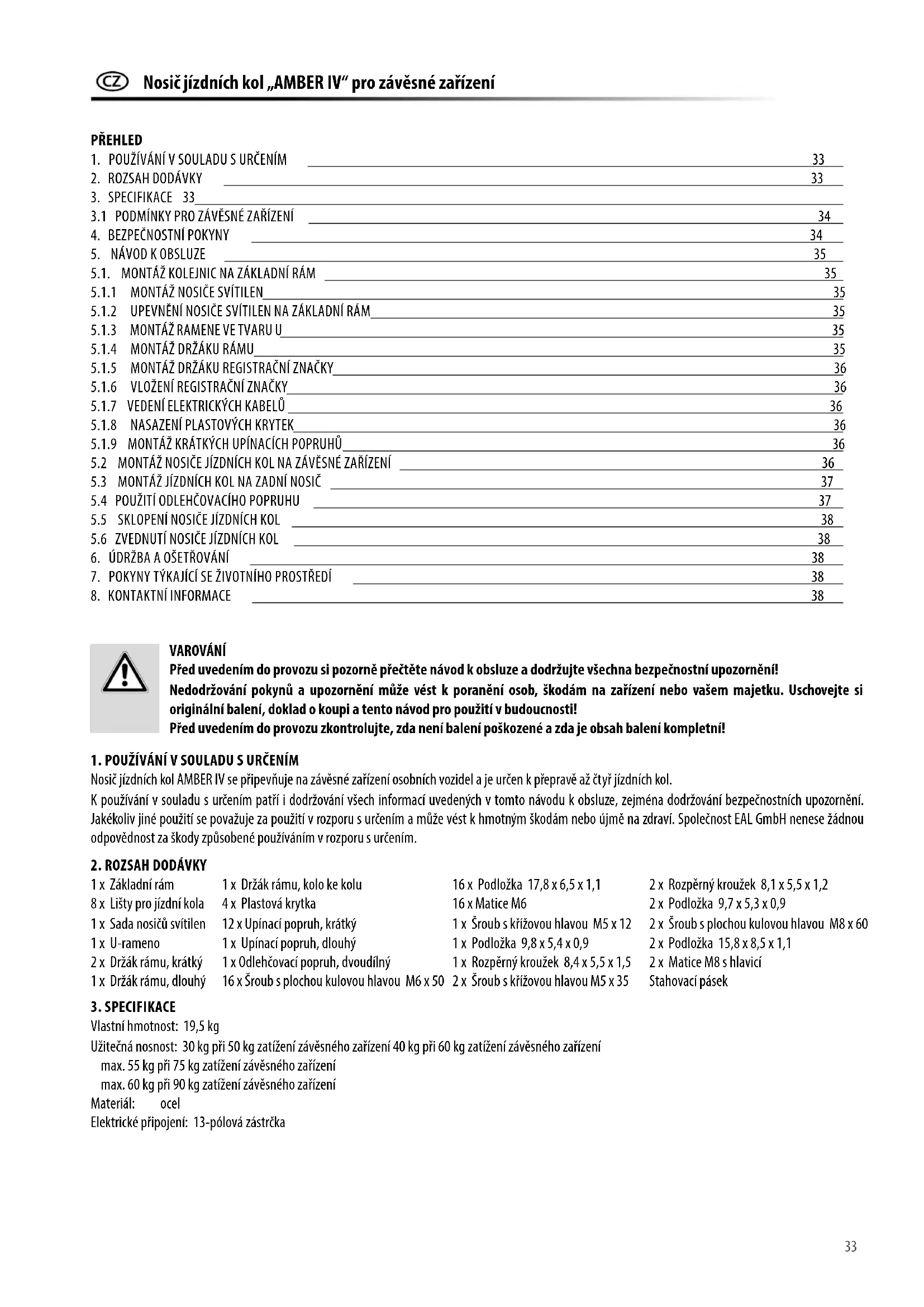Nosič jízdních kol AMBER IV se připevňuje na závěsné zařízení osobních vozidel a je určen k přepravě až čtyř jízdních kol. K používání v souladu s určením patří i dodržování všech informací uvedených v tomto návodu k obsluze, zejména dodržování bezpečnostních upozornění. Jakékoliv jiné použití se považuje za použití v rozporu s určením a může vést k hmotným škodám nebo újmě na zdraví. Společnost EAL GmbH nenese žádnou odpovědnost za škody způsobené používáním v rozporu s určením.