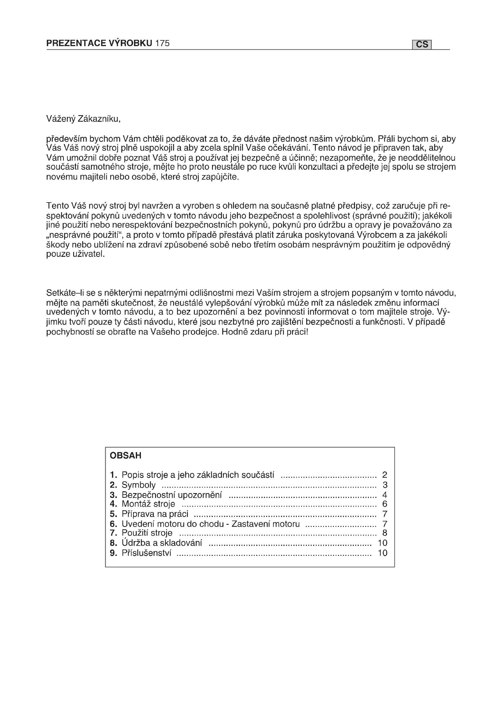 Vážený Zákazníku, především bychom Vám chtěli poděkovat za to, že dáváte přednost našim výrobkům. Přáli bychom si, aby Vás Váš nový stroj plně uspokojil a aby zcela splnil Vaše očekávání. Tento návod je připraven tak, aby Vám umožnil dobře poznat Váš stroj a používat jej bezpečně a účinně; nezapomeňte, že je neoddělitelnou součástí samotného stroje, mějte ho proto neustále po ruce kvůli konzultaci a předejte jej spolu se strojem novému majiteli nebo osobě, které stroj zapůjčíte. Tento Váš nový stroj byl navržen a vyroben s ohledem na současně platné předpisy, což zaručuje při re- spektování pokynů uvedených v tomto návodu jeho bezpečnost a spolehlivost (správné použití); jakékoli jiné použití nebo nerespektování bezpečnostních pokynů, pokynů pro údržbu a opravy je považováno za „nesprávné použití“, a proto v tomto případě přestává platit záruka poskytovaná Výrobcem a za jakékoli škody nebo ublížení na zdraví způsobené sobě nebo třetím osobám nesprávným použitím je odpovědný pouze uživatel. Setkáte–li se s některými nepatrnými odlišnostmi mezi Vaším strojem a strojem popsaným v tomto návodu, mějte na paměti skutečnost, že neustálé vylepšování výrobků může mít za následek změnu informací uvedených v tomto návodu, a to bez upozornění a bez povinnosti informovat o tom majitele stroje. Vý- jimku tvoří pouze ty části návodu, které jsou nezbytné pro zajištění bezpečnosti a funkčnosti. V případě pochybností se obraťte na Vašeho prodejce. Hodně zdaru při práci! OBSAH