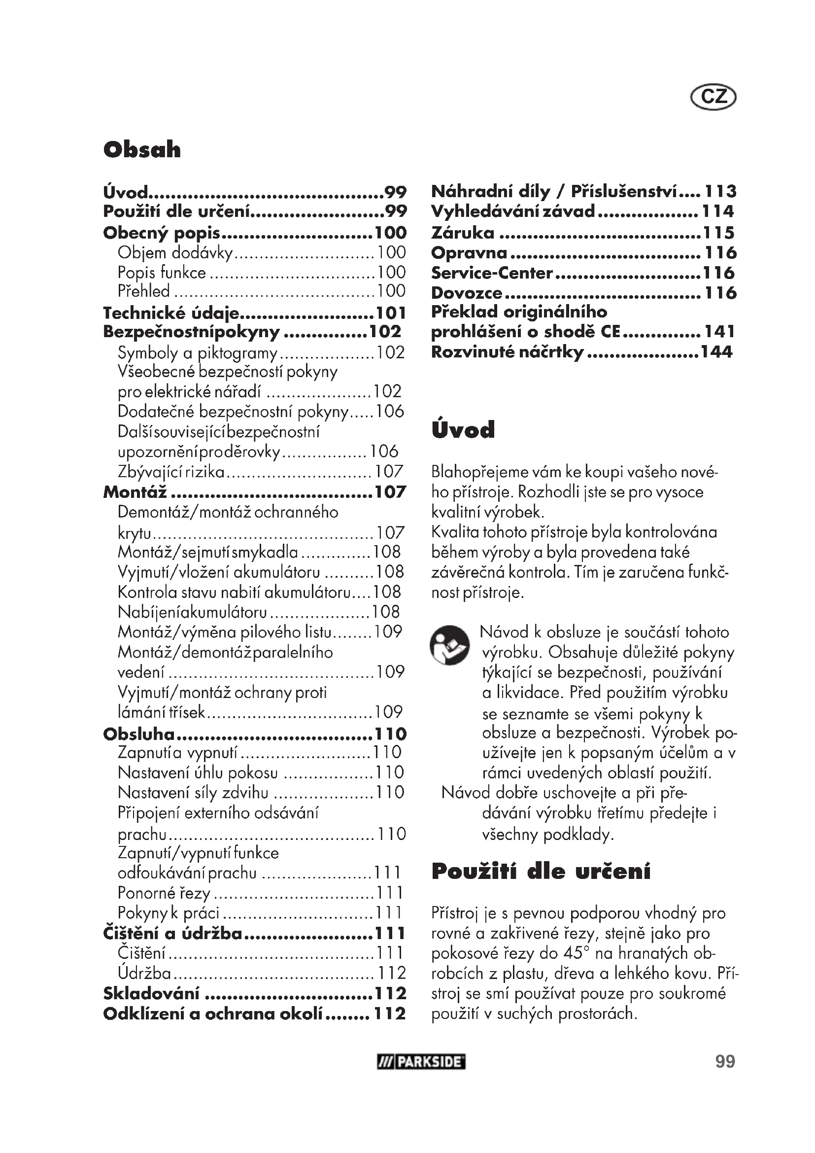 - Úvod Blahopřejeme vám ke koupi vašeho nové- ho přístroje. Rozhodli jste se pro vysoce kvalitní výrobek. Kvalita tohoto přístroje byla kontrolována během výroby a byla provedena také závěrečná kontrola. Tím je zaručena funkč- nost přístroje. Návod k obsluze je součástí tohoto výrobku. Obsahuje důležité pokyny týkající se bezpečnosti, používání a likvidace. Před použitím výrobku se seznamte se všemi pokyny k obsluze a bezpečnosti. Výrobek po- užívejte jen k popsaným účelům a v rámci uvedených oblastí použití. Návod dobře uschovejte a při pře- dávání výrobku třetímu předejte i všechny podklady. Použití dle určení Přístroj je s pevnou podporou vhodný pro rovné a zakřivené řezy, stejně jako pro pokosové řezy do 45° na hranatých ob- robcích z plastu, dřeva a lehkého kovu. Pří- stroj se smí používat pouze pro soukromé použití v suchých prostorách. Překlad originálního prohlášení o shodě CE p. 141