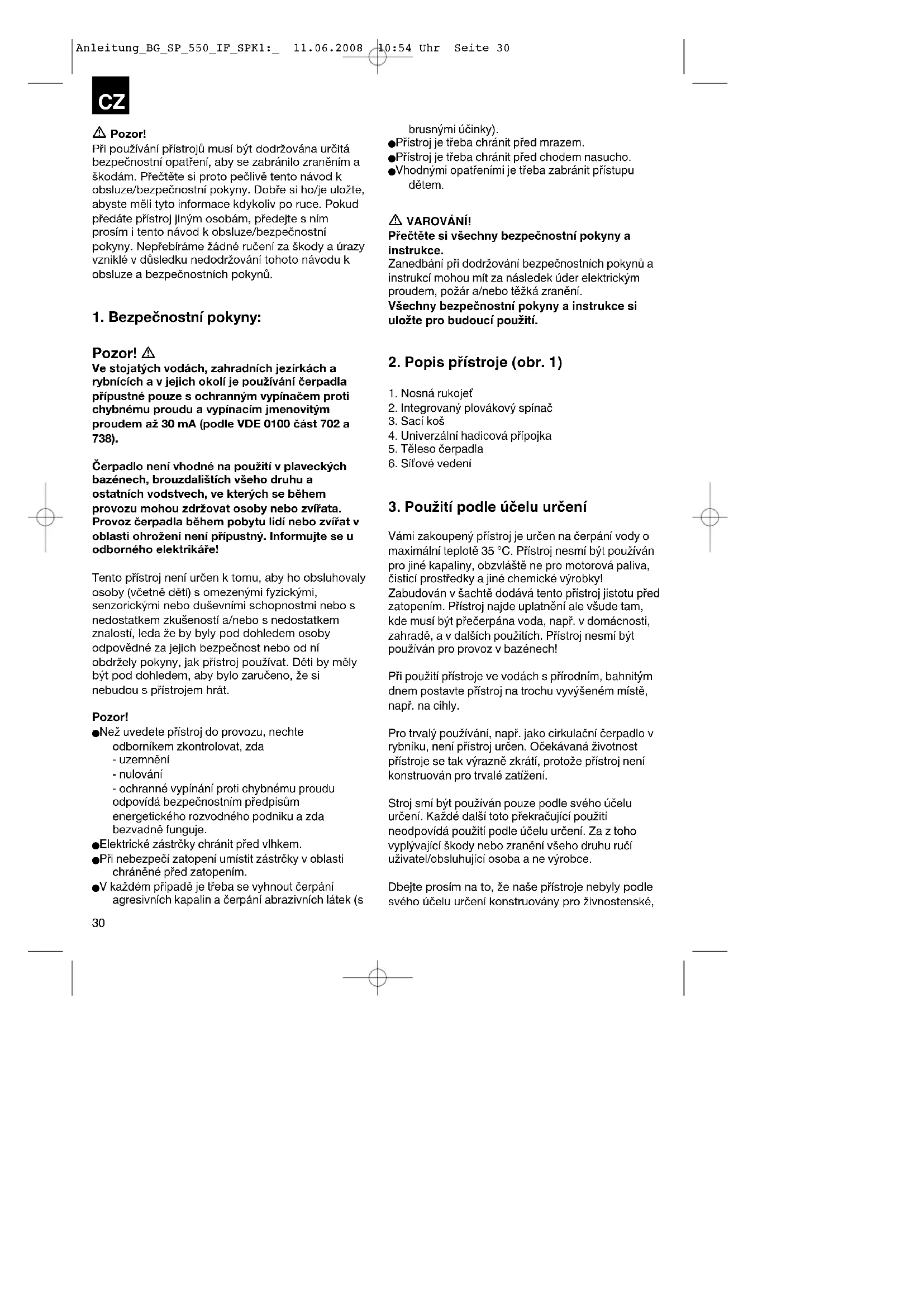 Anleitung_BG_SP_550_IF_SPK1:_ 11.06.2008 10:54 Uhr Seite 29 Pozor! Při používání přístrojů musí být dodržována určitá bezpečnostní opatření, aby se zabránilo zraněním a škodám. Přečtěte si proto pečlivě tento návod k obsluze/bezpečnostní pokyny. Dobře si ho/je uložte, abyste měli tyto informace kdykoliv po ruce. Pokud předáte přístroj jiným osobám, předejte s ním prosím i tento návod k obsluze/bezpečnostní pokyny. Nepřebíráme žádné ručení za škody a úrazy vzniklé v důsledku nedodržování tohoto návodu k obsluze a bezpečnostních pokynů.
