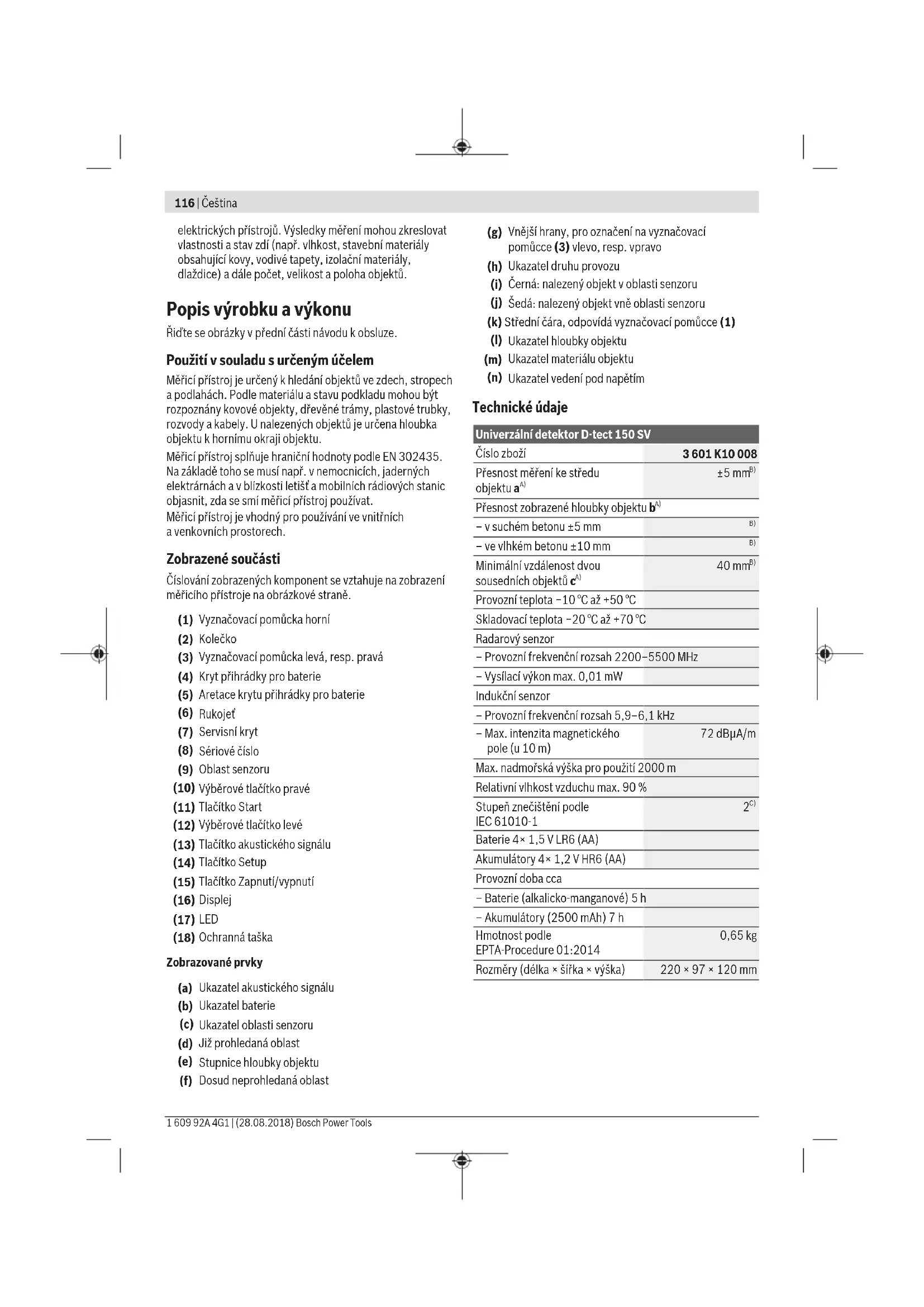 Baterie 4×1,5V LR6(AA) Akumulátory 4×1,2V HR6(AA) Provozní doba cca – Baterie (alkalicko-manganové) 5 h – Akumulátory (2500mAh) 7h Hmotnost podle EPTA-Procedure 01:2014 0,65kg Rozměry (délka × šířka × výška) 220×97×120mmUniverzální detektor D-tect 150 SV Stupeň krytí IP54 (ochrana proti prachu astříkající vodě) A) Viz obrázek