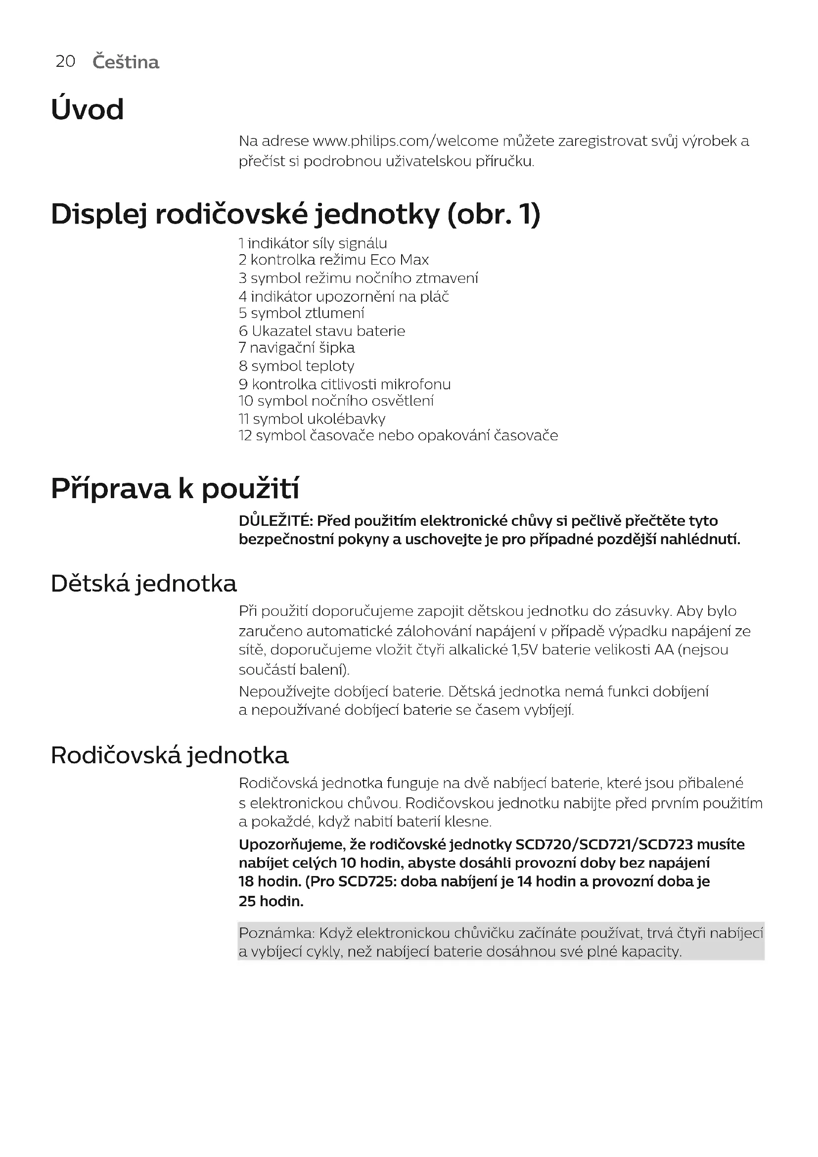 Upozornujeme, ze rodičovské Jednotky SCD720/SCD721/SCD723 musité nabíjet celých 10 hodin, abyste dosáhli provozné doby bez napájení 18 hodin. (Pro SCD725: doba nabíjení je 14 hodin a provozné doba je 25 hodin.