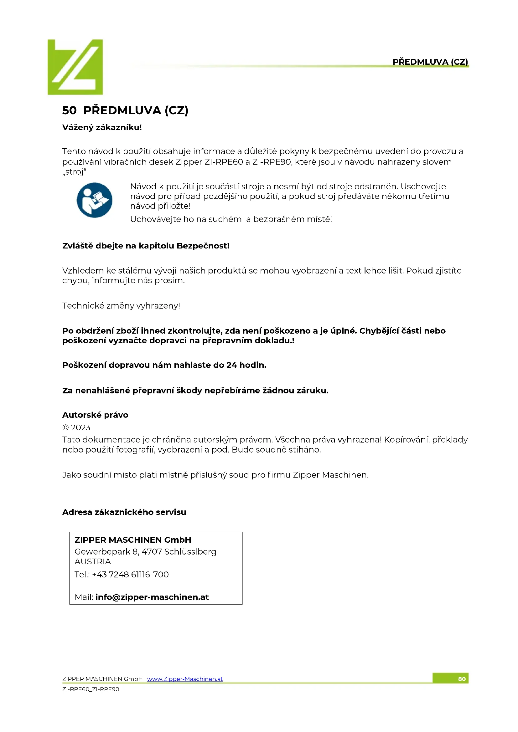 Zvláště dbejte na kapitolu Bezpečnost! Vzhledem ke stálému vývoji našich produktů se mohou vyobrazení a text lehce lišit. Pokud zjistíte chybu, informujte nás prosím. Technické změny vyhrazeny! Po obdržení zboží ihned zkontrolujte, zda není poškozeno a je úplné. Chybějící části nebo poškození vyznačte dopravci na přepravním dokladu.! Poškození dopravou nám nahlaste do 24 hodin. Za nenahlášené přepravní škody nepřebíráme žádnou záruku. Autorské právo © 2023 Tato dokumentace je chráněna autorským právem. Všechna práva vyhrazena! Kopírování, překlady nebo použití fotografií, vyobrazení a pod. Bude soudně stíháno. Jako soudní místo platí místně příslušný soud pro firmu Zipper Maschinen.