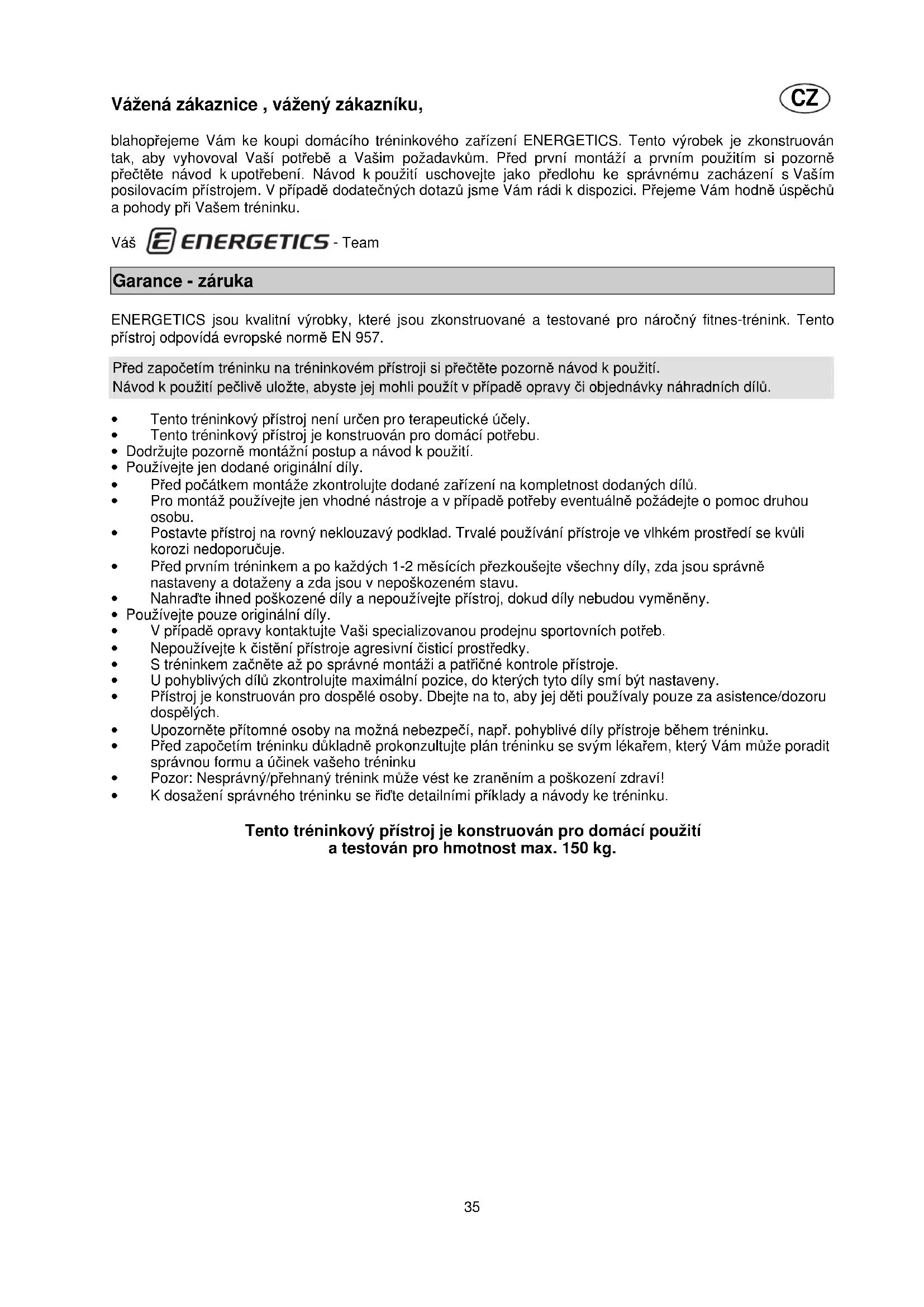 blahopřejeme Vám ke koupi domácího tréninkového zařízení ENERGETICS. Tento výrobek je zkonstruován tak, aby vyhovoval Vaší potřebě a Vašim požadavkům. Před první montáží a prvním použitím si pozorně přečtěte návod k upotřebení. Návod k použití uschovejte jako předlohu ke správnému zacházení s Vaším posilovacím přístrojem. V případě dodatečných dotazů jsme Vám rádi k dispozici. Přejeme Vám hodně úspěchů a pohody při Vašem tréninku. Váš - Team Garance - záruka ENERGETICS jsou kvalitní výrobky, které jsou zkonstruované a testované pro náročný fitnes-trénink. Tento přístroj odpovídá evropské normě EN 957. Před započetím tréninku na tréninkovém přístroji si přečtěte pozorně návod k použití. Návod k použití pečlivě uložte, abyste jej mohli použít v případě opravy či objednávky náhradních dílů.
