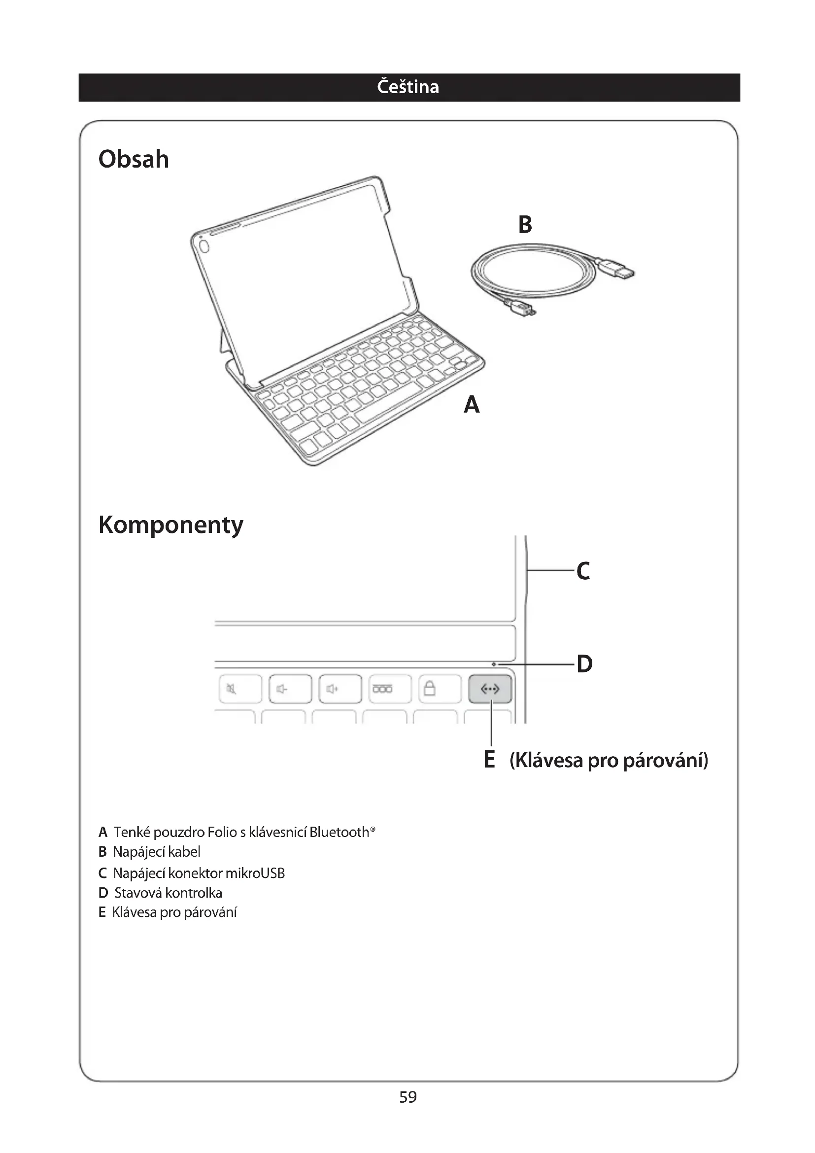 KeyFolio obsahuje lithio-polymerovou baterii, která je hořlavá. Chraťne prežd otevěrným ohněm. - Pro prédcházeni zkratu ājineho potenciániho nebezpečí zabraťe kovovým preydmetúm jako jsou mince āk lǐče v kontaktu s vyrobkem KeyFolio ani do něj āci jeho otvorůnevkládeje tci zprédměty.