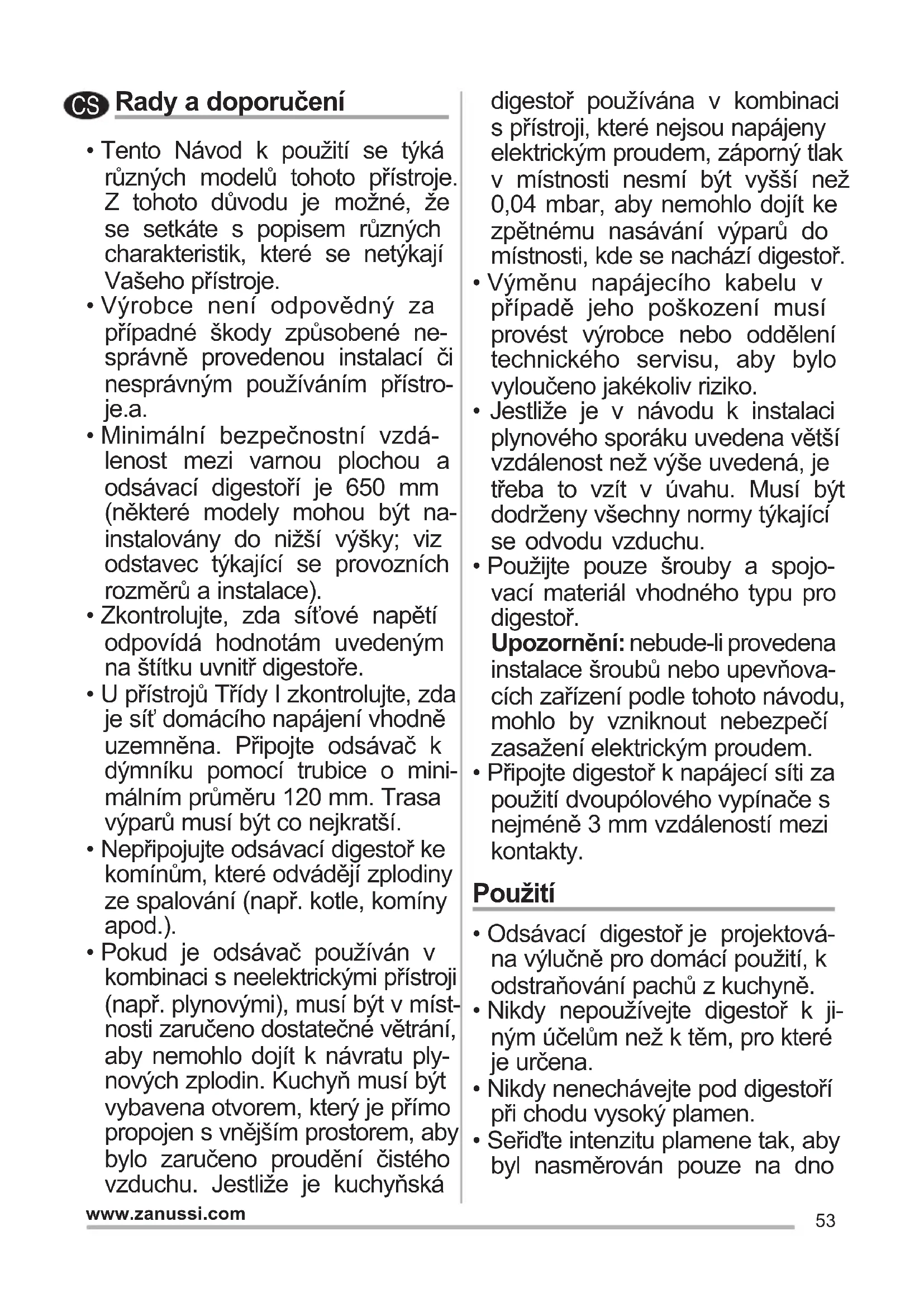 - Nikdy nepoužívejte digestoř k ji- ným účelům než k těm, pro které je určena.