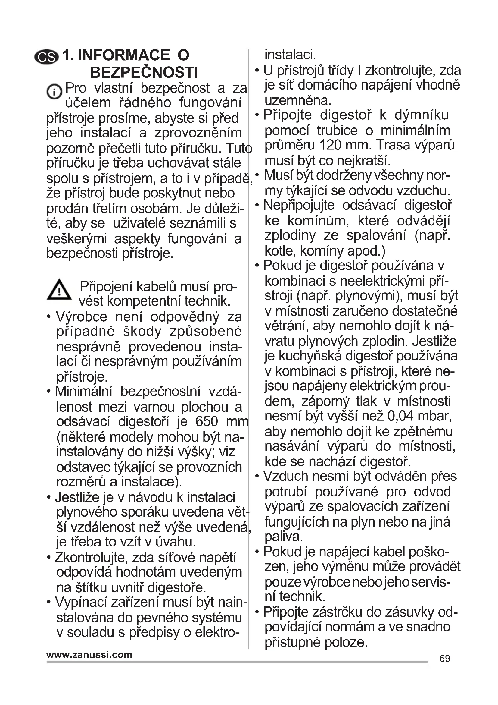 zpracování maximálního množ- ství výparů i během dlouhého časového úseku. 5.OSVĚTLENÍ Žárovka Příkon (W) Patice Napětí (V) Rozměry (mm) Kód ILCOS 4 E14 220-240 107 x 37 DRBB/F-4-220-240-E14-35/10073 www.zanussi.com 1.BEZPEČNOSTNÉ INFORMÁCIE Na zaistenie vlastnej bezpeč- nosti a správneho fungovania spotrebiča si pozorne prečítajte túto príručku ešte pred jeho inšta- láciou a uvedením do prevádzky. Tento návod uchovávajte vždy v blízkosti spotrebiča, aj v prípade predaja alebo odovzdania inej osobe. Je dôležité, aby používa- telia poznali všetky charakteristiky fungovania a bezpečnosti spotre- biča. Elektrické zapojenie spotre- biču musí urobiť kvalikova- ný technik.