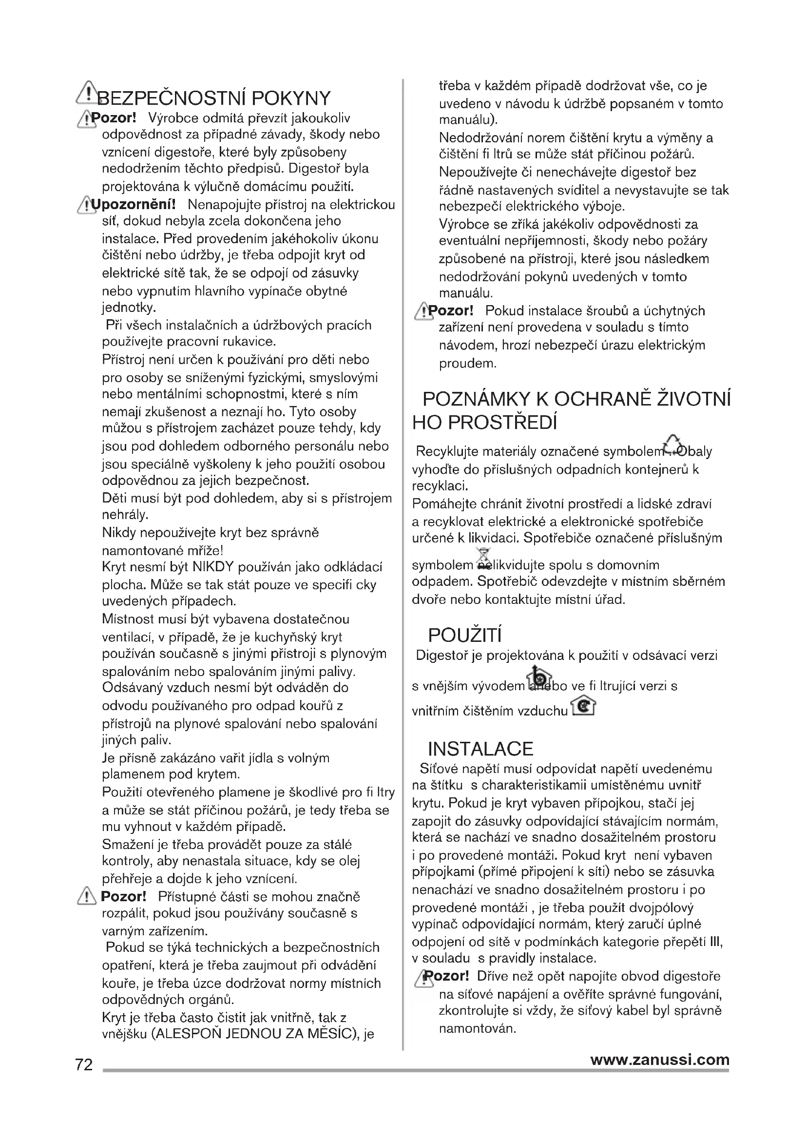Recyklujte materiály označené symbolem . Obaly vyhoďte do příslušných odpadních kontejnerů k recyklaci. Pomáhejte chránit životní prostředí a lidské zdraví a recyklovat elektrické a elektronické spotřebiče určené k likvidaci. Spotřebiče označené příslušným symbolem nelikvidujte spolu s domovním odpadem. Spotřebič odevzdejte v místním sběrném dvoře nebo kontaktujte místní úřad. POUŽITÍ Digestoř je projektována k použití v odsávací verzi s vnějším vývodem anebo ve fi ltrující verzi s vnitřním čištěním vzduchu . INSTALACE Síťové napětí musí odpovídat napětí uvedenému na štítku s charakteristikamii umístěnému uvnitř krytu. Pokud je kryt vybaven přípojkou, stačí jej zapojit do zásuvky odpovídající stávajícím normám, která se nachází ve snadno dosažitelném prostoru i po provedené montáži. Pokud kryt není vybaven přípojkami (přímé připojení k síti) nebo se zásuvka nenachází ve snadno dosažitelném prostoru i po provedené montáži , je třeba použít dvojpólový vypínač odpovídající normám, který zaručí úplné odpojení od sítě v podmínkách kategorie přepětí III, v souladu s pravidly instalace. Pozor! Dříve než opět napojíte obvod digestoře na síťové napájení a ověříte správné fungování, zkontrolujte si vždy, že síťový kabel byl správně namontován.73 www.zanussi.com Minimální vzdálenost mezi podporou nádoby na varné ploše a nejnižší částí digestoře nesmí být menší než 43cm v případě elektrických sporáků 65cm v případě plynových či smíšených sporáků. Pokud návod na instalaci varného zařízení na plyn doporučují větší vzdálenost, je třeba se tímto pokynem řídit. ÚDRŽBA Pozor! Před jakoukoliv operací čištění či údržby odpojte digestoř od elektrické sítě, vyjměte zátrčku anebo vypněte hlavní spínač bytu. Digestoř musí být často čištěna, jak uvnitř tak zevně (alespoň stejně často jako je prováděna údržba fi ltrů proti mastnotám). Pro čištění je třeba použít látku navlhčenou neutrálními tekutými čistícími prostředky. Nepouživejte prostředky obsahující brusné látky. NEPOUŽÍVEJTE ALKOHOL! Pozor! Nedodržení norem čištění přístroje a vyměňování fi ltrů by mohlo vést k požárům. Doporučujeme tedy dodržovat návod k použití. Výrobce odmítá jakoukoliv zodpovědnost za škody na motoru, požáry způsobené nesprávnou údržbou či nedodržením výše uvedeného upozornění. Tukový fi ltr - Tukový fi ltr se musí 1 x do měsíce vyčistit . Je možné jej čistit ručně jemným mycím prostředkem nebo v kuchyňské myčce při nejnižší teplotě a kratším programu. NEUMYVATELNÝ fi ltr s aktivními uhlíky Saturace fi ltru s uhlíkem nastane po více či méně dlouhém užití, tj. závisí na typu kuchyně a pravidel- ném čištění fi ltru proti mastnotám. V každém případě je nutné nahradit patronu maximálně jednou za 4 měsíce. NEMŮŽE být umýván či regenerován. Clack!