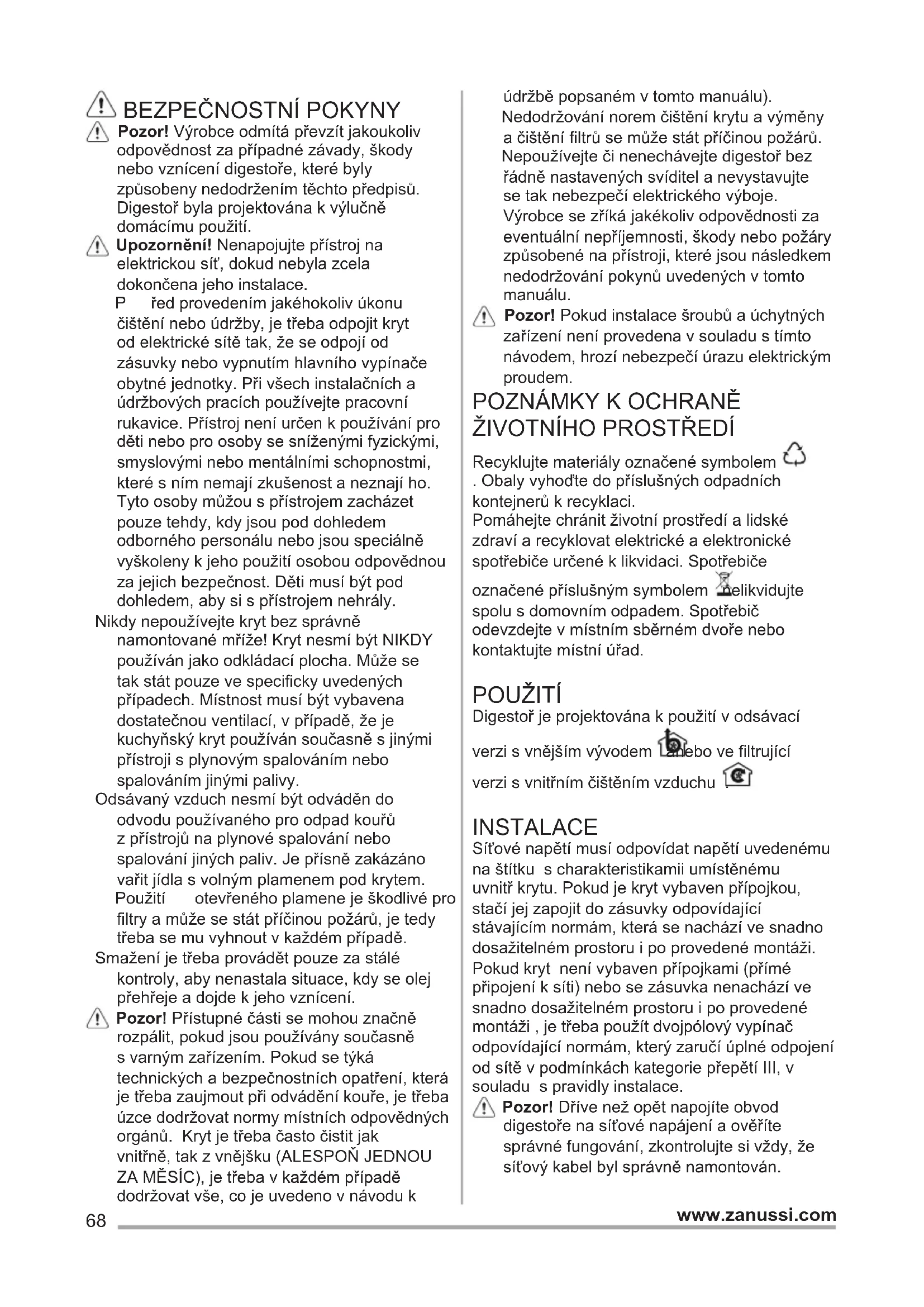 Recyklujte materiály označené symbolem . Obaly vyhoďte do příslušných odpadních kontejnerů k recyklaci. Pomáhejte chránit životní prostředí a lidské zdraví a recyklovat elektrické a elektronické spotřebiče určené k likvidaci. Spotřebiče označené příslušným symbolem nelikvidujte spolu s domovním odpadem. Spotřebič odevzdejte v místním sběrném dvoře nebo kontaktujte místní úřad. POUŽITÍ Digestoř je projektována k použití v odsávací verzi s vnějším vývodem anebo ve filtrující verzi s vnitřním čištěním vzduchu . INSTALACE Síťové napětí musí odpovídat napětí uvedenému na štítku s charakteristikamii umístěnému uvnitř krytu. Pokud je kryt vybaven přípojkou, stačí jej zapojit do zásuvky odpovídající stávajícím normám, která se nachází ve snadno dosažitelném prostoru i po provedené montáži. Pokud kryt není vybaven přípojkami (přímé připojení k síti) nebo se zásuvka nenachází ve snadno dosažitelném prostoru i po provedené montáži , je třeba použít dvojpólový vypínač odpovídající normám, který zaručí úplné odpojení od sítě v podmínkách kategorie přepětí III, v souladu s pravidly instalace. Pozor! Dříve než opět napojíte obvod digestoře na síťové napájení a ověříte správné fungování, zkontrolujte si vždy, že síťový kabel byl správně namontován.69 www.zanussi.com Minimální vzdálenost mezi podporou nádoby na varné ploše a nejnižší částí digestoře nesmí být menší než 50cm v případě elektrických sporáků 65cm v případě plynových či smíšených sporáků. Pokud návod na instalaci varného zařízení na plyn doporučují větší vzdálenost, je třeba se tímto pokynem řídit. ÚDRŽBA Pozor! Před jakoukoliv operací čištění či údržby odpojte digestoř od elektrické sítě, vyjměte zátrčku anebo vypněte hlavní spínač bytu. Digestoř musí být často čištěna, jak uvnitř tak zevně (alespoň stejně často jako je prováděna údržba fi ltrů proti mastnotám). Pro čištění je třeba použít látku navlhčenou denaturovaným líhem anebo neutrálními tekutými čistícími prostředky. Nepouživejte prostředky obsahující brusné látky. NEPOUŽÍVEJTE ALKOHOL! Pozor! Nedodržení norem čištění přístroje a vyměňování filtrů by mohlo vést k požárům. Doporučujeme tedy dodržovat návod k použití. Výrobce odmítá jakoukoliv zodpovědnost za škody na motoru, požáry způsobené nesprávnou údržbou či nedodržením výše uvedeného upozornění. Tukový fi ltr - Tukový fi ltr se musí 1 x do měsíce vyčistit . Je možné jej čistit ručně jemným mycím prostředkem nebo v kuchyňské myčce při nejnižší teplotě a kratším programu. Type 20 LONG LIFE - Umyvatelný fi ltr s aktivními uhlíky Filtr se musí každé 2 měsíce vyčistit ručně v teplé vodě vhodným mycím prostředkem nebo v kuchyňské myčce při kompletním programu bez přítomnosti nádobí. Po vyčištění zbavte fi ltr přebytečné vody tak, aby jste jej nepoškodili. Vyjměte jej z plastového rámu a důkladně vysušte při teplotě 100°C po dobu 10-ti minut v elektrické troubě. Filtr s aktivním uhlíkem se musí přesto měnit každé 3 roky a navíc vždy, když je poškozen. Type 15 - NEUMYVATELNÝ fi ltr s aktivními uhlíky Saturace fi ltru s uhlíkem nastane po více či méně dlouhém užití, tj. závisí na typu kuchyně a pravidelném čištění fi ltru proti mastnotám. V každém případě je nutné nahradit patronu maximálně jednou za 4 měsíce. NEMŮŽE být umýván či regenerován. (1*) (2*) (3**) (4**) (*) Type 20 (**) Type 15 - Type 2070 www.zanussi.com PŘÍKAZY Odsavač je vybaven ovládacím panelem s ovládáním rychlosti odsávání a zapínáním osvětlení pracovní plochy.