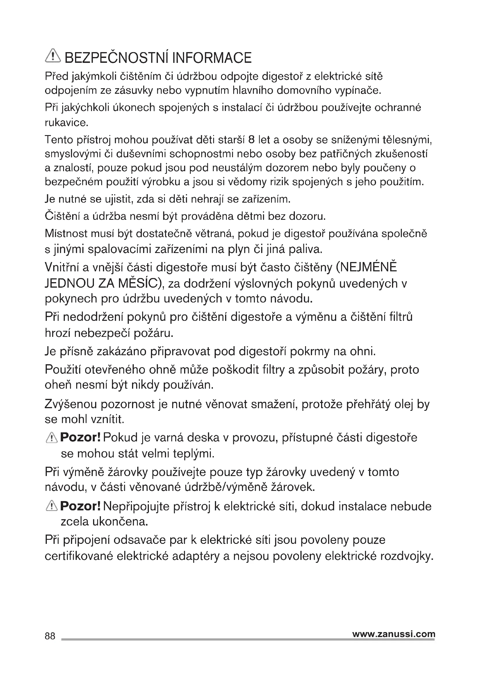 Před jakýmkoli čištěním či údržbou odpojte digestoř z elektrické sítě odpojením ze zásuvky nebo vypnutím hlavního domovního vypínače. Při jakýchkoli úkonech spojených s instalací či údržbou používejte ochranné rukavice. Tento přístroj mohou používat děti starší 8 let a osoby se sníženými tělesnými, smyslovými či duševními schopnostmi nebo osoby bez patřičných zkušeností a znalostí, pouze pokud jsou pod neustálým dozorem nebo byly poučeny o bezpečném použití výrobku a jsou si vědomy rizik spojených s jeho použitím. Je nutné se ujistit, zda si děti nehrají se zařízením. Čištění a údržba nesmí být prováděna dětmi bez dozoru. Místnost musí být dostatečně větraná, pokud je digestoř používána společně s jinými spalovacími zařízeními na plyn či jiná paliva. Vnitřní a vnější části digestoře musí být často čištěny (NEJMÉNĚ JEDNOU ZA MĚSÍC), za dodržení výslovných pokynů uvedených v pokynech pro údržbu uvedených v tomto návodu. Při nedodržení pokynů pro čištění digestoře a výměnu a čištění filtrů hrozí nebezpečí požáru. Je přísně zakázáno připravovat pod digestoří pokrmy na ohni. Použití otevřeného ohně může poškodit filtry a způsobit požáry, proto oheň nesmí být nikdy používán. Zvýšenou pozornost je nutné věnovat smažení, protože přehřátý olej by se mohl vznítit. Pozor! Pokud je varná deska v provozu, přístupné části digestoře se mohou stát velmi teplými. Při výměně žárovky používejte pouze typ žárovky uvedený v tomto návodu, v části věnované údržbě/výměně žárovek. Pozor! Nepřipojujte přístroj k elektrické síti, dokud instalace nebude zcela ukončena. Při připojení odsavače par k elektrické síti jsou povoleny pouze certifikované elektrické adaptéry a nejsou povoleny elektrické rozdvojky.89 www.zanussi.com
