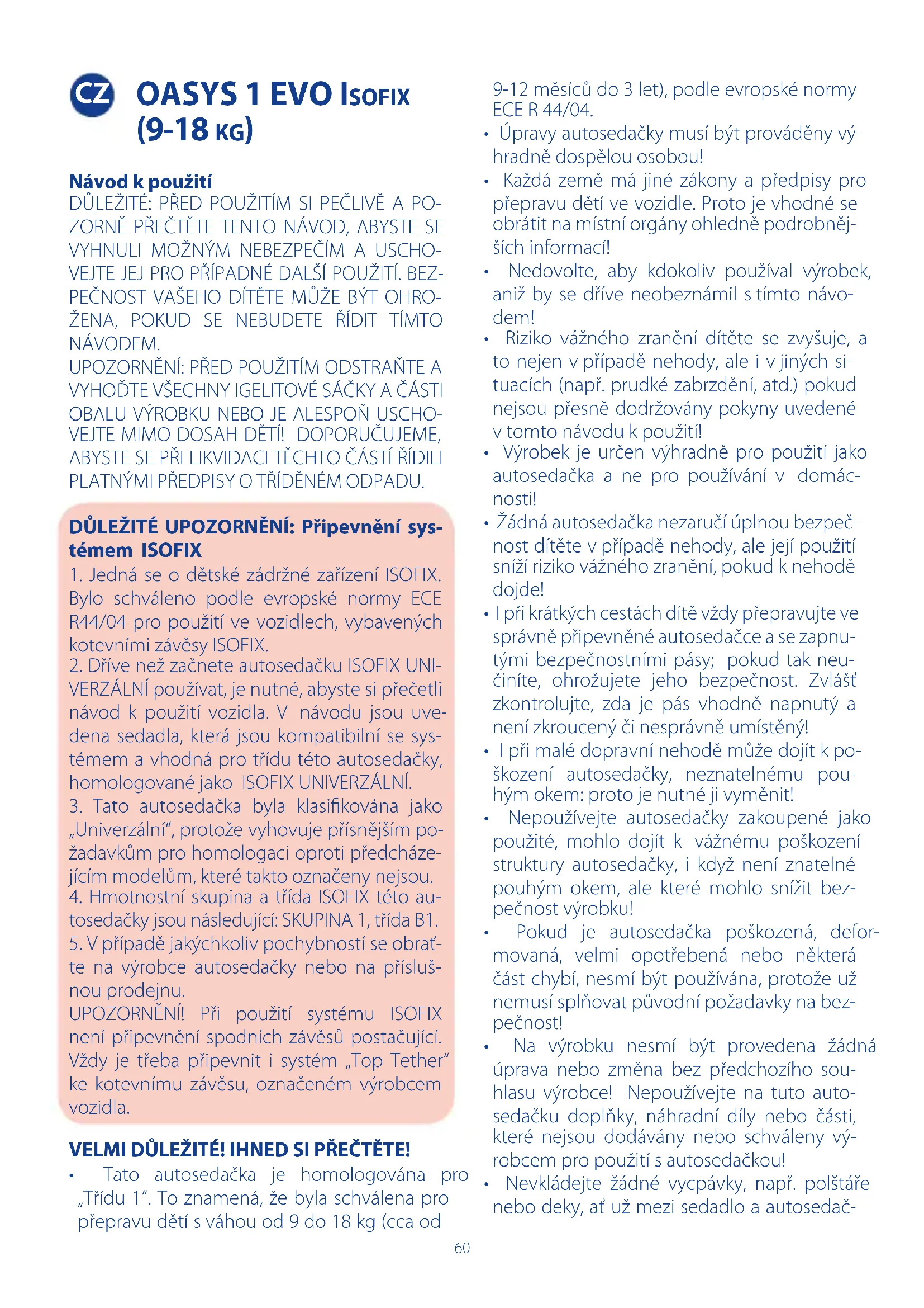 te na výrobce autosedačky nebo na přísluš- nou prodejnu. UPOZORNĚNÍ! Při použití systému ISOFIX není připevnění spodních závěsů postačující. Vždy je třeba připevnit i systém „Top Tether“ ke kotevnímu závěsu, označeném výrobcem vozidla. VELMI DŮLEŽITÉ! IHNED SI PŘEČTĚTE!
