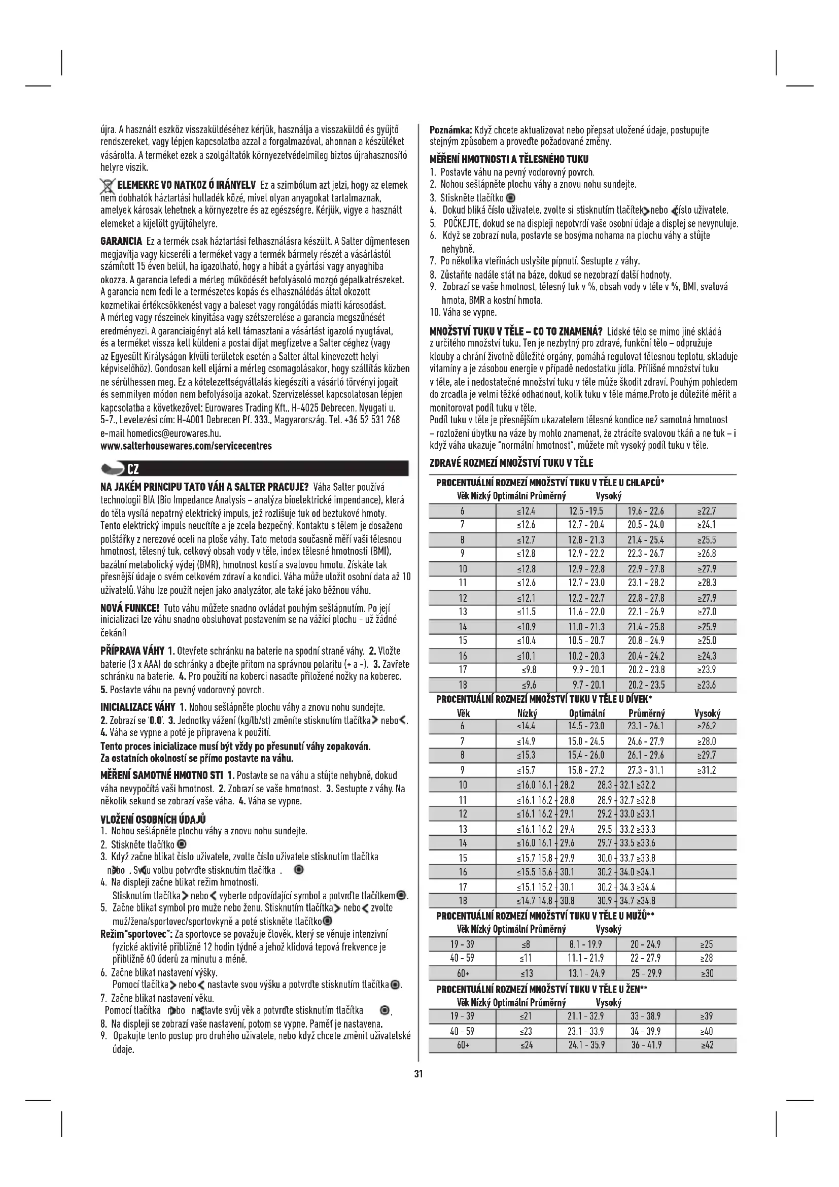 Jak přesně se množství tuku a vody vtěle měří? Tato váha Salter používá kměření metodu známou jako Analýza bioelektrické impedance (BIA).Do těla je skrz plosky nohou a nohy vysílán nepatrný elektrický proud.Tento proud snadno prochází beztukovou svalovou tkání, která má vysoký obsah tekutin, tukem však neprochází tak snadno. Měřením impedance těla (tj. odpor proudu) je tudíž možné určit množství svalové tkáně. Ztoho lze poté odhadnout množství tuku a vody. Jaká je hodnota proudu, který mi během měření prostupuje tělem? Je to bezpečné? Proud má méně než 1mA, což je zanedbatelná a zcela bezpečná hodnota. Ani tento proud neucítíte. Berte prosím na vědomí, že přístroj by neměly používat osoby svnitřní elektronickou lékařskou pomůckou, jako je kardiostimulátor, jako patření proti narušení chodu tohoto přístroje. Když si měřím množství tuku a vody v různou denní dobu, hodnoty bývají velmi rozlišné. Která hodnota je správná? Procentuální podíl tuku vtěle se mění souvisle s množstvím vody vtěle a toto množství se mění vprůběhu dne. Neexistuje správný nebo špatný čas kměření, usilujte se však o měření v pravidelnou dobu, kdy se domníváte, že je vaše tělo normálně hydratovaný. Pokud možno neměřte hodnoty po koupeli nebo sauně, po33 intenzivním cvičení nebo 1-2 hodiny po jídle nebo požití většího množství tekutin. Můj přítel má analyzátor množství tuku vtěle od jiného výrobce. Když jsem ji použil, naměřil mi jiné množství tuku vtěle. Proč tomu tak je? Různé analyzátory množství tuku vtěle měří tuky vodlišných částech těla a používají odlišné matematické algoritmy kvýpočtu procentuálního množství tuku vtěle. Pro sledování změn je nejlepší nesrovnávat výsledky z různých přístrojů, ale pokaždé používat stejný přístroj. Jak si mám vyložit své naměřené hodnoty množství tuku a vody v těle? Porovnejte je s tabulkami množství tuku a vody vtěle, která je součástí balení. Pomohou vám určit, zda naměřené hodnoty množství tuku a vody vtěle spadají do zdravé kategorie (úměrně kvašemu věku a pohlaví). Co mám dělat, pokud je naměřené množství tuku vtěle příliš „vysoké“? Zdravá dieta, příjem tekutin a cvičební režim mohou snížit množství tuku vtěle. Před započetím takového programu je nutné se vždy poradit se zdravotním odborníkem. Proč je takový rozdíl mezi procentuálním podílem tuku u mužů a žen? Ženy mají přirozeně větší obsah tuku než muži, protože mají jinou tělesnou skladbou, připravenou na těhotenství, kojení atd. Co mám dělat, pokud je naměřené množství vody vtěle příliš „nízké“? Ujistěte se, že máte dostatečný příjem vody a usilujte se o dosažení zdravého podílu tuku vtěle. Proč se mám vyvarovat použití váhy pro analýzu složení těla během těhotenství? Během těhotenství se tělesné složení značně mění za účelem podpory vyvíjejícího se dítěte. Za těchto okolností by mohly být hodnoty množství tuku vtěle nepřesné a zavádějící. Těhotné ženy by tudíž měly používat pouze funkci kměření hmotnosti. RADY KPOUŽITÍ A PÉČI • Vždy se važte na stejné váze a stejné podlaze Neporovnávejte hmotnosti naměřené na různých vahách, protože mezi nimi budou zdůvodu výrobních tolerancí určité rozdíly. • Postavením váhy na pevný, rovnoměrný povrch zajistíte větší přesnost a přesnější opakované vážení. • Každý den se važte ve stejnou dobu před jídlem a bez obuvi. Hned ráno je dobrá chvíle. • Váha zaokrouhluje hmotnost nahoru nebo dolů na nejbližší přírůstek. Pokud se zvážíte dvakrát a naměříte dvě různé hodnoty, vaše hmotnost leží mezi těmito dvěma čísly. • Čistěte váhu vlhkým hadříkem. Nepoužívejte chemické čistící prostředky. • Zamezte namočení váhy, protože to by mohlo poškodit elektronické části. • Pečujte o svou váhu sopatrností - je to precizní nástroj. Neupusťte ji a neskačte na ni. ŘEŠENÍ PROBLÉMŮ • Při měření množství tuku v těle a celkového množství vody v těle musíte mít bosé nohy. • Stav kůže na plosce nohy může ovlivnit naměřené hodnoty. Než se postavíte na váhu, pro co nejpřesnější a nejvíce konzistentní hodnoty si otřete nohy vlhkým hadříkem a nechejte je trochu navlhčené.