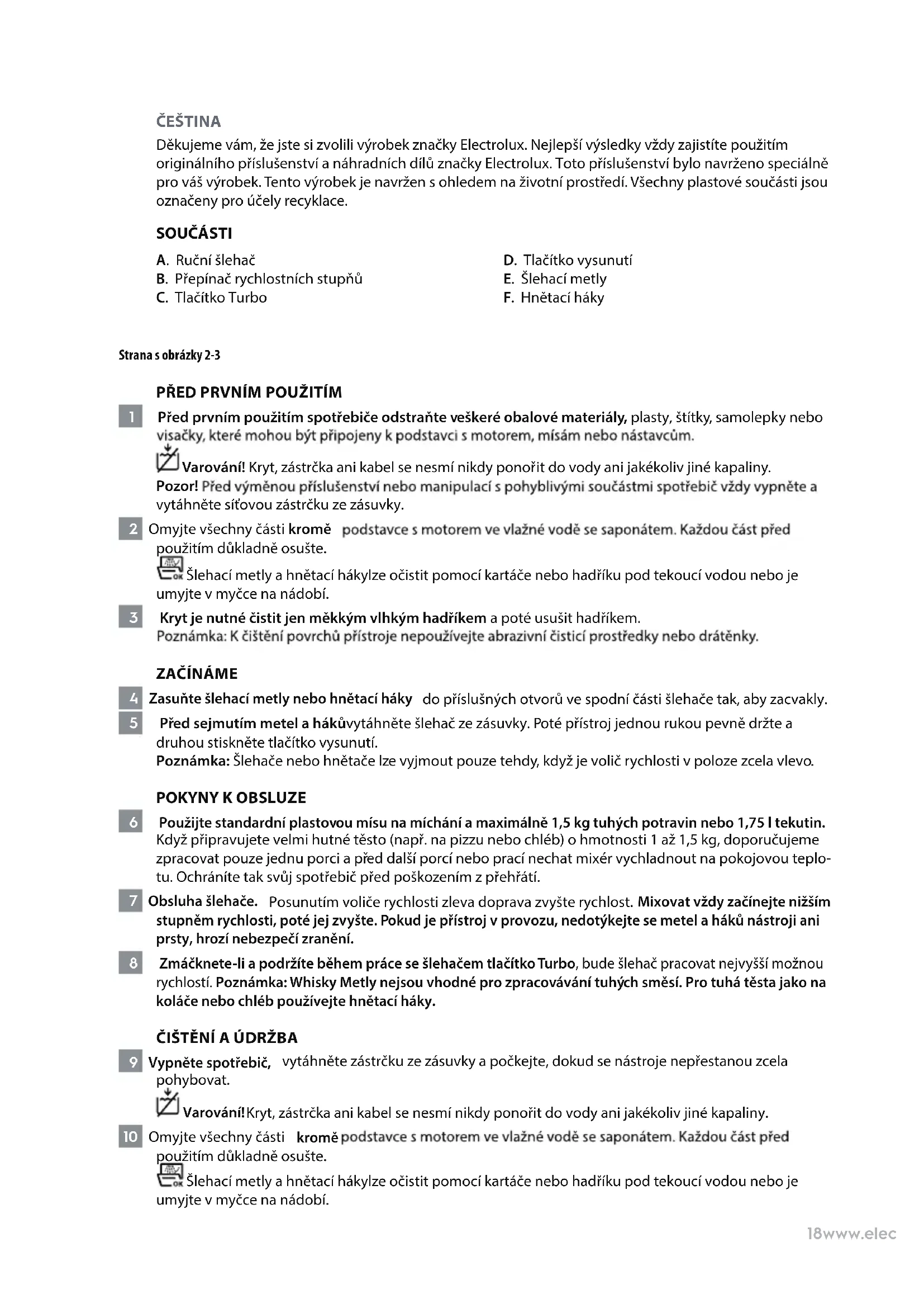 Този символ върху продукта указва, че продуктът съдържа батерия, която не трябва да се изхвърля с обичайните домакински отпадъци. Този симвъл върху продукта или върху опаковката му указва, че продуктът може да не се изхвърля като домакинскии уреди. За рециклиране на продукта ви го занесете на официално място за събиране на електроуреди или център на Electrolux, който може да извади и рециклира безопасно и професионално батерията и електрическите части. Изпълнявайте правната уредба на вашата държава за разделно събиране на електрически продукти и презареждащи се батерии. Electrolux си запазва правото да променя продукти, информация и спецификации без предизвестие.18www.electrolux.com ČEŠTINA Děkujeme vám, že jste si zvolili výrobek značky Electrolux. Nejlepší výsledky vždy zajistíte použitím originálního příslušenství a náhradních dílů značky Electrolux. Toto příslušenství bylo navrženo speciálně pro váš výrobek. Tento výrobek je navržen s ohledem na životní prostředí. Všechny plastové součásti jsou označeny pro účely recyklace. SOUČÁSTI A. Ruční šlehač B. Přepínač rychlostních stupňů C. Tlačítko Turbo D. Tlačítko vysunutí E. Šlehací metly F. Hnětací háky Strana s obrázky 2-3 PŘED PRVNÍM POUŽITÍM 1 Před prvním použitím spotřebiče odstraňte veškeré obalové materiály, plasty, štítky, samolepky nebo Varování! Kryt, zástrčka ani kabel se nesmí nikdy ponořit do vody ani jakékoliv jiné kapaliny. Pozor! vytáhněte síťovou zástrčku ze zásuvky. 2 Omyjte všechny části kromě použitím důkladně osušte. Šlehací metly a hnětací hákylze očistit pomocí kartáče nebo hadříku pod tekoucí vodou nebo je umyjte v myčce na nádobí. 3 Kryt je nutné čistit jen měkkým vlhkým hadříkem a poté usušit hadříkem.