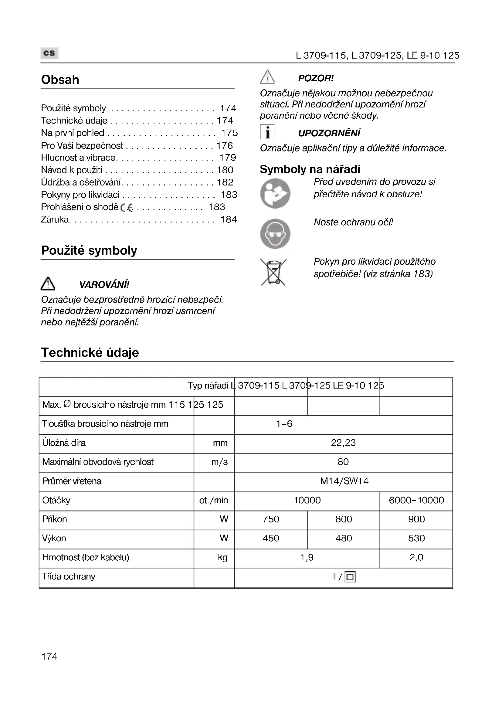 - Záruka Použité symboly VAROVÁNÍ! Označuje bezprostøednì hrozící nebezpečí. Pøi nedodržení upozornìní hrozí usmrcení nebo nejtìžší poranìní. POZOR! Označuje nìjakou možnou nebezpečnou situaci. Pøi nedodržení upozornìní hrozí poranìní nebo vìcné škody. UPOZORNÌNÍ Označuje aplikační tipy a dùležité informace. Symboly na náøadí Pøed uvedením do provozu si pøečtìte návod k obsluze! Noste ochranu očí! Pokyn pro likvidaci použitého spotøebiče! (viz stránka 183) Technické údaje Typ náøadí L 3709-115 L 3709-125 LE 9-10 125 Max. p. 184