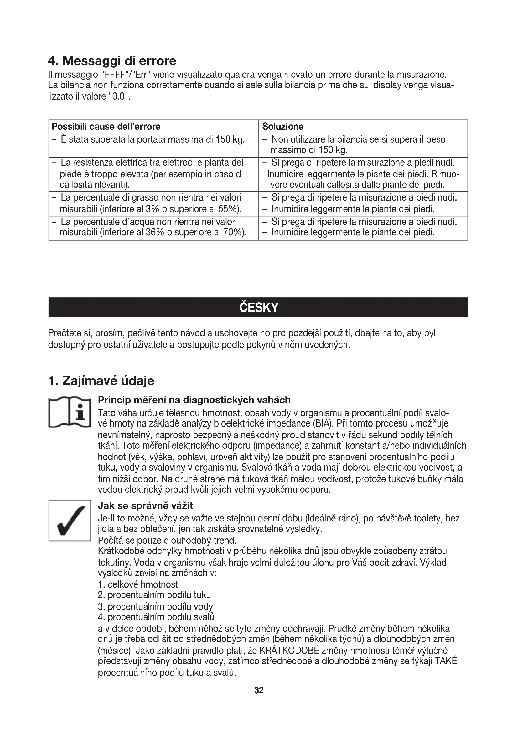 uschovejte k pozdějšímu použití! Upozornění: Váhu nesmí používat osoby s implantáty (například kardiostimulátory). Jinak může dojít k poškození jejich funkce. Upozornění - Pro Vaši bezpečnost – Nepoužívejte během těhotenství. Plodová voda může způsobit nepřesnost měření. – Pozor! Nestoupejte na váhu mokrýma nohama nebo když je povrch váhy vlhký - nebezpečí uklouznutí! – Chraňte váhu před nárazy, vlhkostí, prachem, chemikáliemi, velkými změnami teploty a držte ji mimo dosah zdrojů tepla (kamna, radiátory). – Opravy smí provádět pouze zákaznická služba nebo autorizovaní prodejci. Vždy však zkontrolujte ba- terie a vyměňte je předtím, bude-li to nutné, než přistoupíte k reklamaci. – Všechny váhy splňují požadavky směrnice ES č. 2004/108/EC a jejích dodatků. Pokud budete mít další otázky ohledně používání našich výrobků, obraťte se, prosím, na svého prodejce nebo na zákaznickou službu. – Váhu je třeba příležitostně čistit vlhkým hadříkem. Nepoužívejte agresivní čisticí prostředky a váhu nik- dy nenamáčejte. – Zařízení je určeno pouze k soukromému použití a není určeno pro lékařské či komerční účely. – Diagnostické váhy lze předem nastavit pro věk v rozsahu 10 až 100 let a výšku 100 až 220 cm (3 stopy a 3 palce až 7 stop a 3 palce). Váha může vážit až do maximální zátěže 150 kg (330 liber, 24 kamenů). Měření hmotnosti se zobrazuje v přírůstcích po 100 g (0,2 libry, 1/6 kamene). Výsledky měření procen- tuálních podílů tělesného tuku, obsahu vody v těle a svalů se zobrazují v přírůstcích o 0,1 %. – Při předání zákazníkovi je váha nastavena na jednotky „cm“ a „kg“. Spínač umístěný na zadní straně váhy Vám umožní přepnout na „palce“, „libry“ a „kameny“ (lb, st). – Zlikvidujte prosím přístroj dle nařízení o starých elektrických a elektronických přístrojích 2002/96/ EC – WEEE (Waste Electrical and Elektronik Equipment). Pokud máte dotazy, obraťte se na příslušný komunální úřad, který má na starosti likvidaci.
