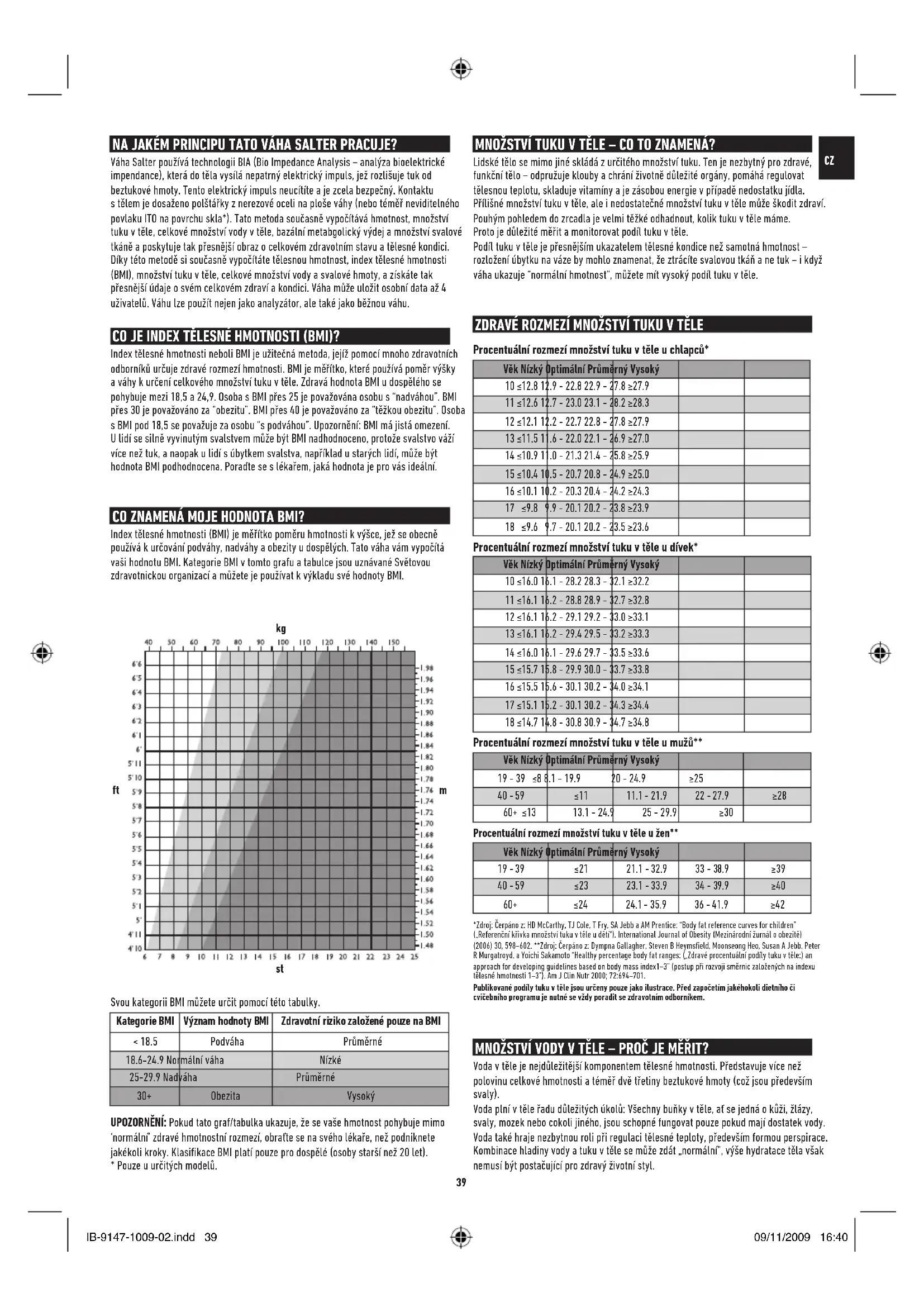 NA JAKÉM PRINCIPU TATO VÁHA SALTER PRACUJE? Váha Salter používá technologii BIA (Bio Impedance Analysis – analýza bioelektrické impendance), která do těla vysílá nepatrný elektrický impuls, jež rozlišuje tuk od beztukové hmoty. Tento elektrický impuls neucítíte a je zcela bezpečný. Kontaktu stělem je dosaženo polštářky znerezové oceli na ploše váhy (nebo téměř neviditelného povlaku ITO na povrchu skla*). Tato metoda současně vypočítává hmotnost, množství tuku v těle, celkové množství vody vtěle, bazální metabgolický výdej a množství svalové tkáně a poskytuje tak přesnější obraz o celkovém zdravotním stavu a tělesné kondici. Díky této metodě si současně vypočítáte tělesnou hmotnost, index tělesné hmotnosti (BMI), množství tuku v těle, celkové množství vody a svalové hmoty, a získáte tak přesnější údaje o svém celkovém zdraví a kondici. Váha může uložit osobní data až 4 uživatelů. Váhu lze použít nejen jako analyzátor, ale také jako běžnou váhu. MNOŽSTVÍ TUKU VTĚLE – CO TO ZNAMENÁ? Lidské tělo se mimo jiné skládá zurčitého množství tuku. Ten je nezbytný pro zdravé, funkční tělo – odpružuje klouby a chrání životně důležité orgány, pomáhá regulovat tělesnou teplotu, skladuje vitamíny a je zásobou energie vpřípadě nedostatku jídla. Přílišné množství tuku vtěle, ale i nedostatečné množství tuku vtěle může škodit zdraví. Pouhým pohledem do zrcadla je velmi těžké odhadnout, kolik tuku vtěle máme. Proto je důležité měřit a monitorovat podíl tuku vtěle. Podíl tuku vtěle je přesnějším ukazatelem tělesné kondice než samotná hmotnost – rozložení úbytku na váze by mohlo znamenat, že ztrácíte svalovou tkáň a ne tuk – i když váha ukazuje “normální hmotnost“, můžete mít vysoký podíl tuku vtěle. MNOŽSTVÍ VODY VTĚLE – PROČ JE MĚŘIT? Voda vtěle je nejdůležitější komponentem tělesné hmotnosti. Představuje více než polovinu celkové hmotnosti a téměř dvě třetiny beztukové hmoty (což jsou především svaly). Voda plní vtěle řadu důležitých úkolů: Všechny buňky vtěle, ať se jedná o kůži, žlázy, svaly, mozek nebo cokoli jiného, jsou schopné fungovat pouze pokud mají dostatek vody. Voda také hraje nezbytnou roli při regulaci tělesné teploty, především formou perspirace. Kombinace hladiny vody a tuku vtěle se může zdát „normální”, výše hydratace těla však nemusí být postačující pro zdravý životní styl. ZDRAVÉ ROZMEZÍ MNOŽSTVÍ TUKU V TĚLE Procentuální rozmezí množství tuku v těle u chlapců* Věk Nízký Optimální Průměrný Vysoký 10 ≤12.8 12.9 - 22.8 22.9 - 27.8 ≥27.9 11 ≤12.6 12.7 - 23.0 23.1 - 28.2 ≥28.3 12 ≤12.1 12.2 - 22.7 22.8 - 27.8 ≥27.9 13 ≤11.5 11.6 - 22.0 22.1 - 26.9 ≥27.0 14 ≤10.9 11.0 - 21.3 21.4 - 25.8 ≥25.9 15 ≤10.4 10.5 - 20.7 20.8 - 24.9 ≥25.0 16 ≤10.1 10.2 - 20.3 20.4 - 24.2 ≥24.3 17 ≤9.8 9.9 - 20.1 20.2 - 23.8 ≥23.9 18 ≤9.6 9.7 - 20.1 20.2 - 23.5 ≥23.6 Procentuální rozmezí množství tuku v těle u dívek* Věk Nízký Optimální Průměrný Vysoký 10 ≤16.0 16.1 - 28.2 28.3 - 32.1 ≥32.2 11 ≤16.1 16.2 - 28.8 28.9 - 32.7 ≥32.8 12 ≤16.1 16.2 - 29.1 29.2 - 33.0 ≥33.1 13 ≤16.1 16.2 - 29.4 29.5 - 33.2 ≥33.3 14 ≤16.0 16.1 - 29.6 29.7 - 33.5 ≥33.6 15 ≤15.7 15.8 - 29.9 30.0 - 33.7 ≥33.8 16 ≤15.5 15.6 - 30.1 30.2 - 34.0 ≥34.1 17 ≤15.1 15.2 - 30.1 30.2 - 34.3 ≥34.4 18 ≤14.7 14.8 - 30.8 30.9 - 34.7 ≥34.8 Procentuální rozmezí množství tuku v těle u mužů** Věk Nízký Optimální Průměrný Vysoký
