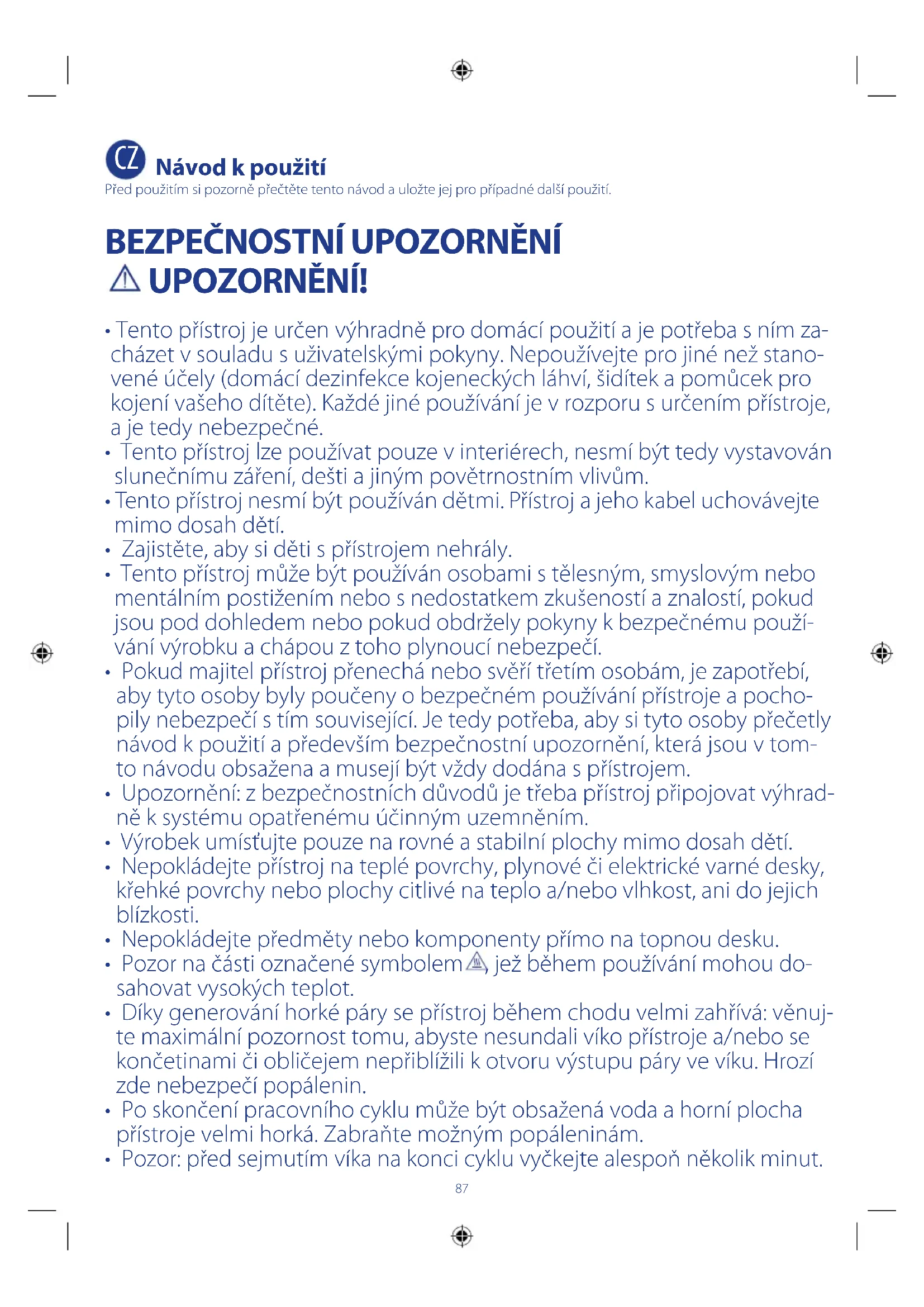 - Tento přístroj je určen výhradně pro domácí použití a je potřeba s ním za- cházet v souladu s uživatelskými pokyny. Nepoužívejte pro jiné než stano- vené účely (domácí dezinfekce kojeneckých láhví, šidítek a pomůcek pro kojení vašeho dítěte). Každé jiné používání je v rozporu s určením přístroje, a je tedy nebezpečné.